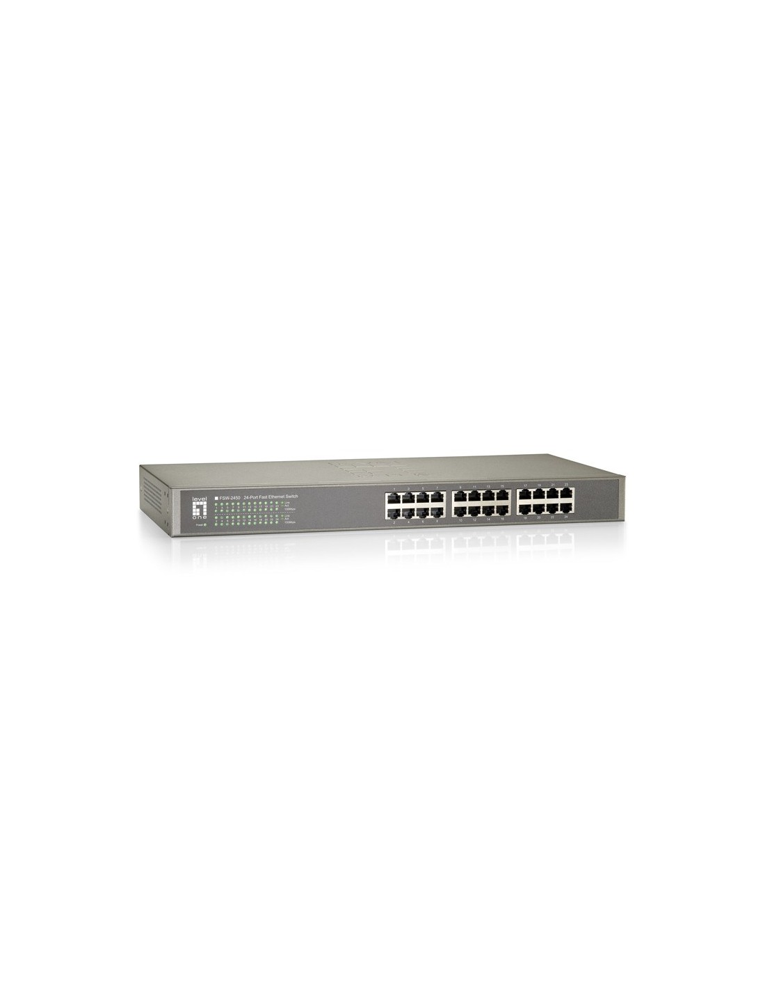 LevelOne FSW-2450. Tipo de interruptor: No administrado. Puertos tipo básico de conmutación RJ-45 Ethernet: Fast Ethernet (10/100), Cantidad de puertos básicos de conmutación RJ-45 Ethernet: 24. Bidireccional completo (Full duplex). Tabla de direcciones MAC: 8192 entradas, Capacidad de conmutación: 4,8 Gbit/s. Estándares de red: IEEE 802.1p, IEEE 802.3, IEEE 802.3u, IEEE 802.3z. Conector eléctrico: Toma de entrada de CC. Montaje en rack
