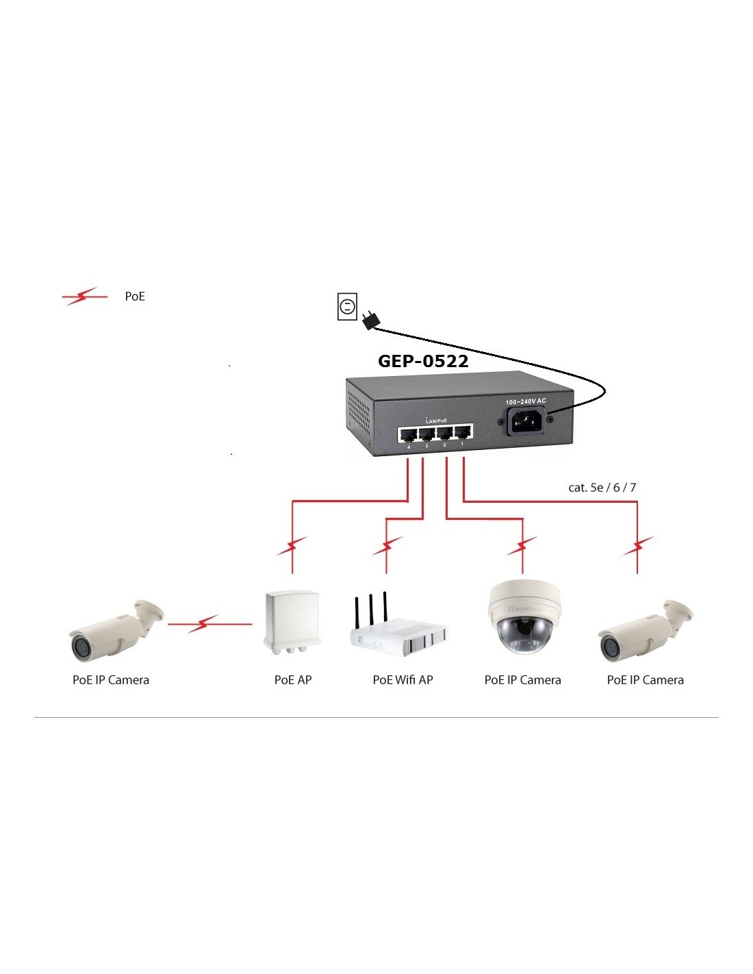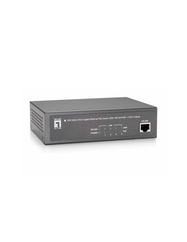 LevelOne GEP-0522. Puertos tipo básico de conmutación RJ-45 Ethernet: Gigabit Ethernet (10/100/1000), Cantidad de puertos básicos de conmutación RJ-45 Ethernet: 5, Puerto de consola: RJ-45. Tabla de direcciones MAC: 2000 entradas. Estándares de red: IEEE 802.3, IEEE 802.3ab, IEEE 802.3af, IEEE 802.3at, IEEE 802.3u, IEEE 802.3x. Energía sobre Ethernet (PoE)