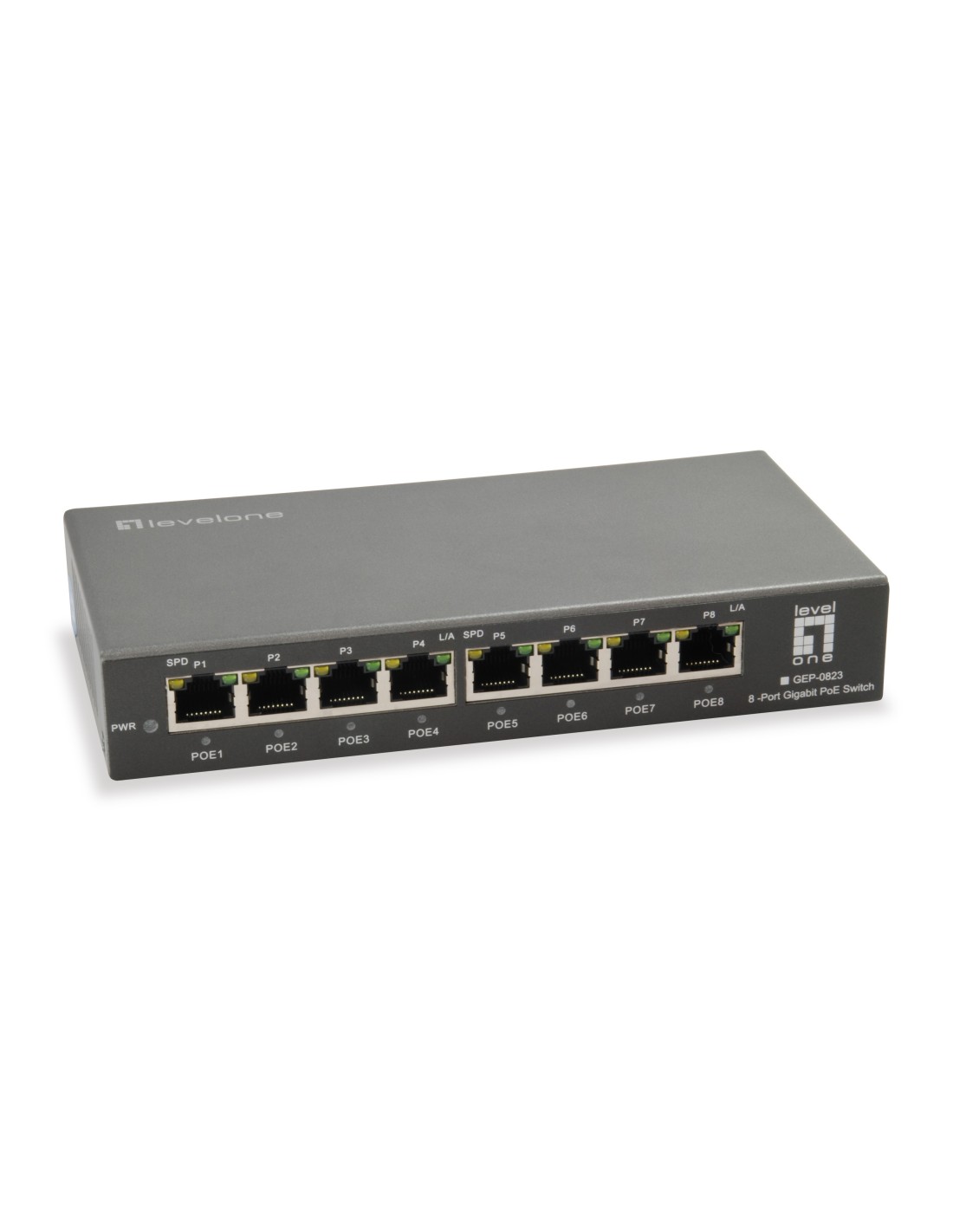 LevelOne GEP-0823. Puertos tipo básico de conmutación RJ-45 Ethernet: Gigabit Ethernet (10/100/1000), Cantidad de puertos básicos de conmutación RJ-45 Ethernet: 8. Bidireccional completo (Full duplex). Tabla de direcciones MAC: 8000 entradas, Capacidad de conmutación: 16 Gbit/s. Estándares de red: IEEE 802.3, IEEE 802.3ab, IEEE 802.3af, IEEE 802.3at, IEEE 802.3u, IEEE 802.3x. Conector eléctrico: Toma de entrada de CC. Energía sobre Ethernet (PoE)