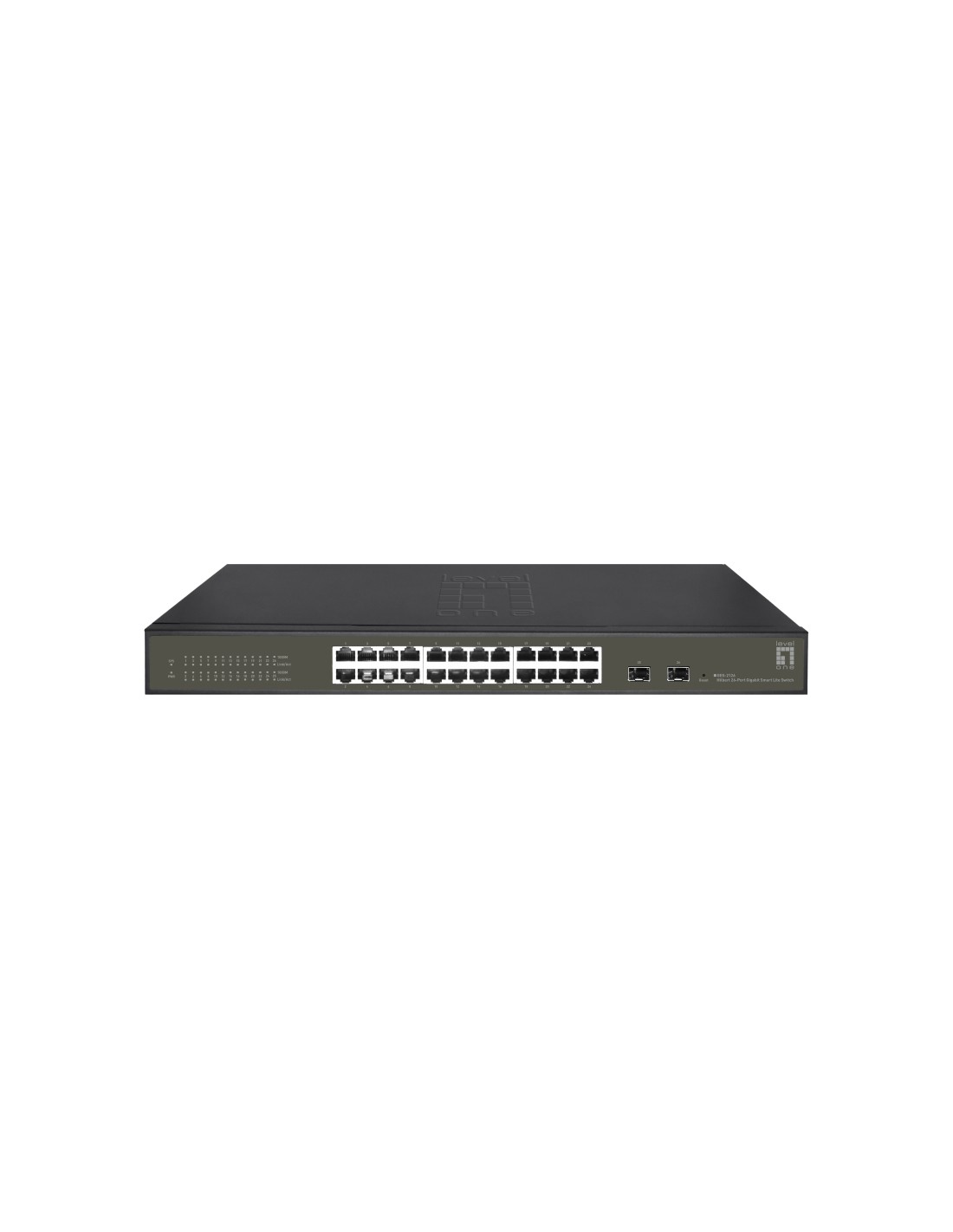 LevelOne GES-2126. Tipo de interruptor: Gestionado, Capa del interruptor: L2. Puertos tipo básico de conmutación RJ-45 Ethernet: Gigabit Ethernet (10/100/1000), Cantidad de puertos básicos de conmutación RJ-45 Ethernet: 24. Bidireccional completo (Full duplex). Tabla de direcciones MAC: 8000 entradas, Capacidad de conmutación: 52 Gbit/s. Estándares de red: IEEE 802.1Q, IEEE 802.1p, IEEE 802.3, IEEE 802.3ab, IEEE 802.3az, IEEE 802.3u, IEEE 802.3x, IEEE.... Montaje en rack