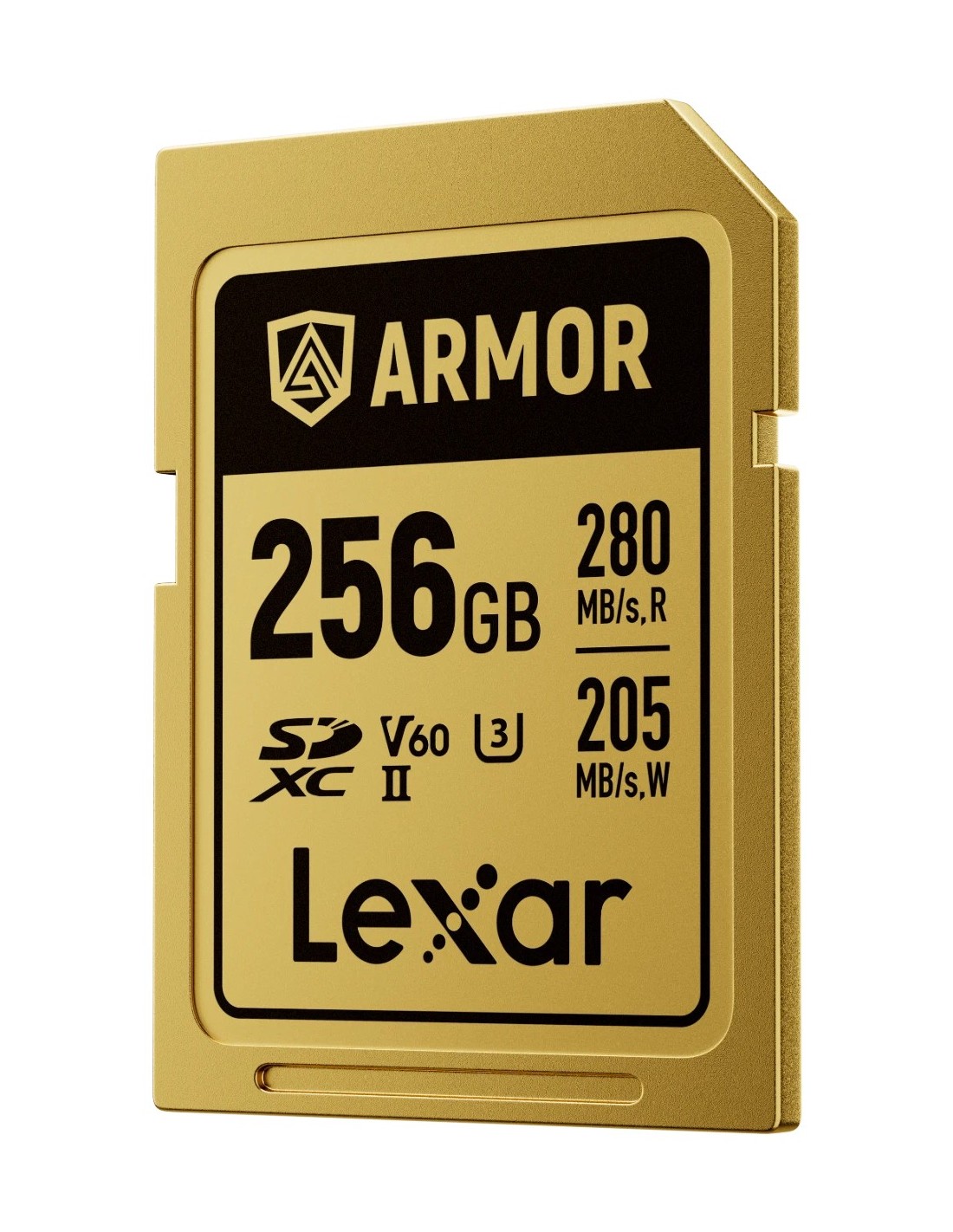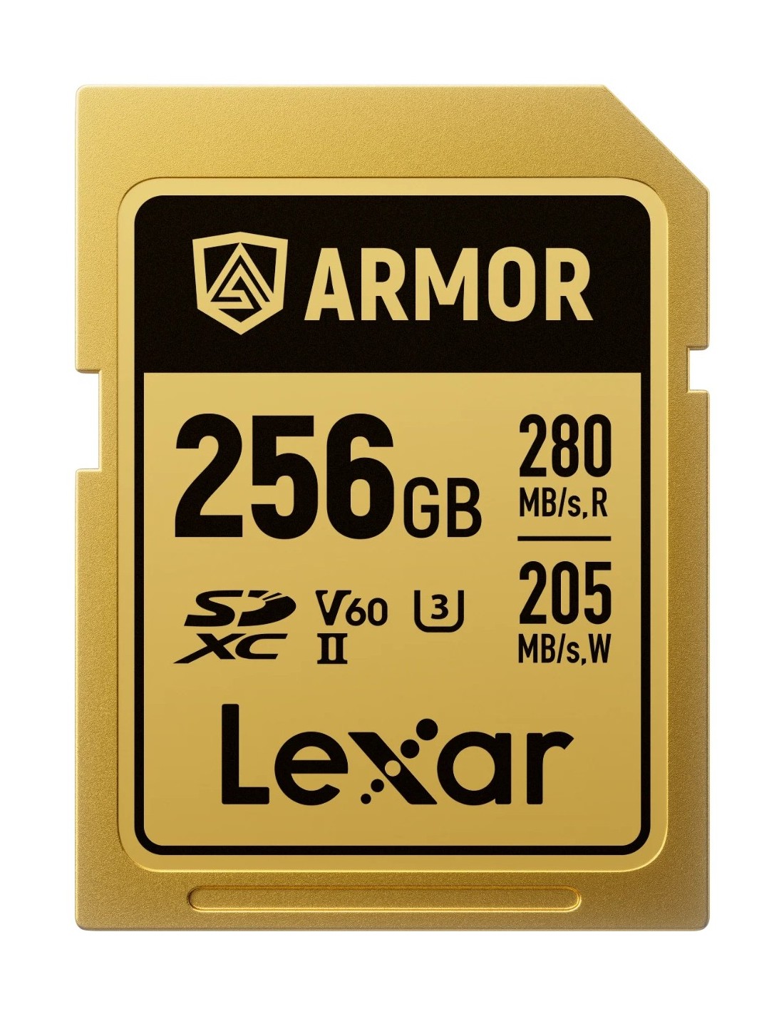 Lexar ARMOR GOLD. Capacidad: 256 GB, Tipo de tarjeta flash: SDXC, Tipo de memoria interna: UHS-II, Velocidad de lectura: 280 MB/s, Velocidad de escritura: 205 MB/s, Clase de velocidad UHS: Class 3 (U3), Clase de velocidad de vídeo: V60. Funciones de protección: Protección contra caídas, Resistente al polvo, Protección contra campos magnéticos,..., Color del producto: Oro