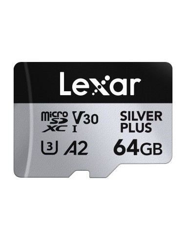 Lexar Professional SILVER PLUS. Capacidad: 64 GB, Tipo de tarjeta flash: MicroSDXC, Tipo de memoria interna: UHS-I, Velocidad de lectura: 205 MB/s, Velocidad de escritura: 100 MB/s, Clase de velocidad UHS: Class 3 (U3), Clase de velocidad de vídeo: V30. Color del producto: Negro, Plata