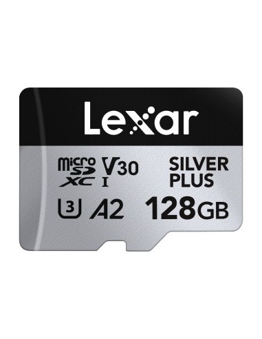 Lexar Professional SILVER PLUS. Capacidad: 128 GB, Tipo de tarjeta flash: MicroSDXC, Tipo de memoria interna: UHS-I, Velocidad de lectura: 205 MB/s, Velocidad de escritura: 150 MB/s, Clase de velocidad UHS: Class 3 (U3), Clase de velocidad de vídeo: V30. Funciones de protección: Protección contra caídas, Resistente a impactos, Protección contra campos magnéticos,..., Color del producto: Negro, Plata