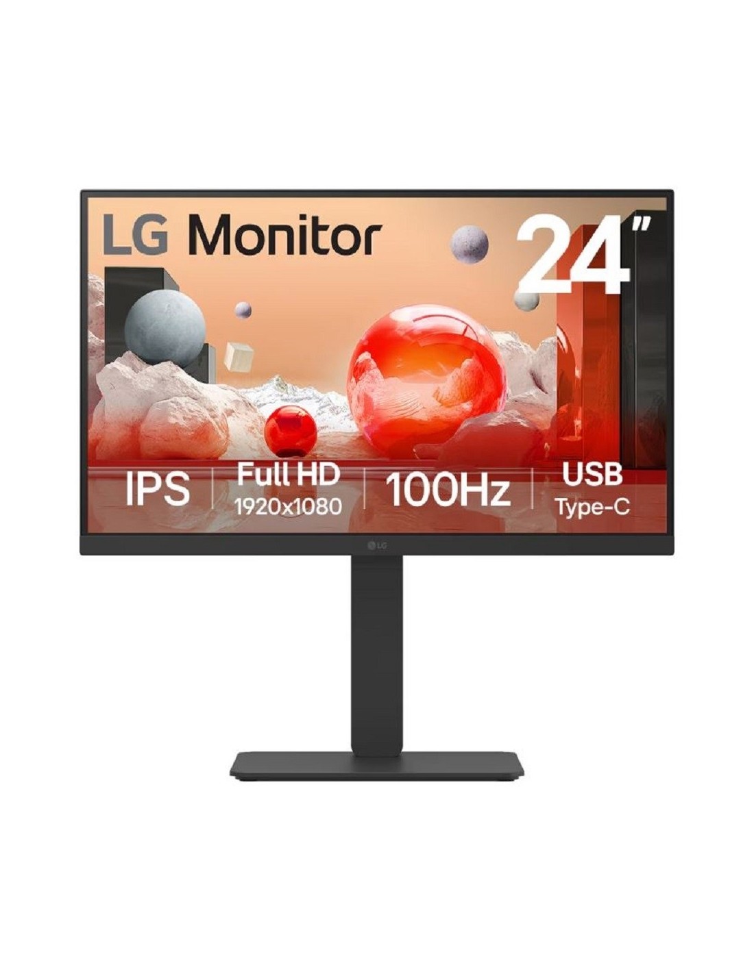 LG 24BA750-B. Diagonal de la pantalla: 60,5 cm (23.8"), Resolución de la pantalla: 1920 x 1080 Pixeles, Tipo HD: Full HD, Tecnología de visualización: LCD, Tiempo de respuesta: 5 ms, Relación de aspecto nativa: 16:9, Ángulo de visión, horizontal: 178°, Ángulo de visión, vertical: 178°. Altavoces incorporados. Conector USB incorporado. montaje VESA, Ajustes de altura. Color del producto: Negro
