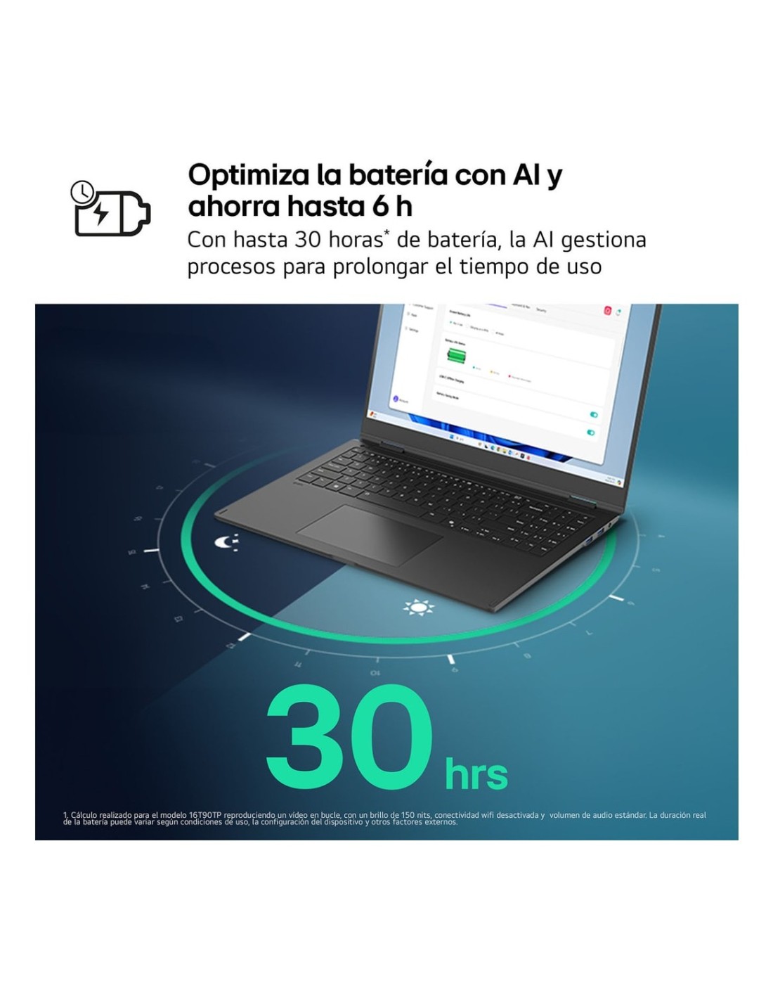 Impulsado por una batería de alta capacidad de 72Wh que ofrece hasta 30 horas debatería y equipado con nuestro Asistente Inteligente AI, gram analiza los patrones del usuario para optimizar la eficiencia de la batería. Aumenta tu productividad y disfruta de un juego ininterrumpido.