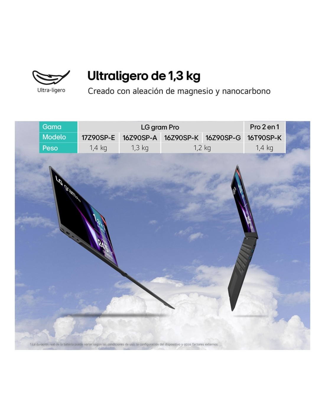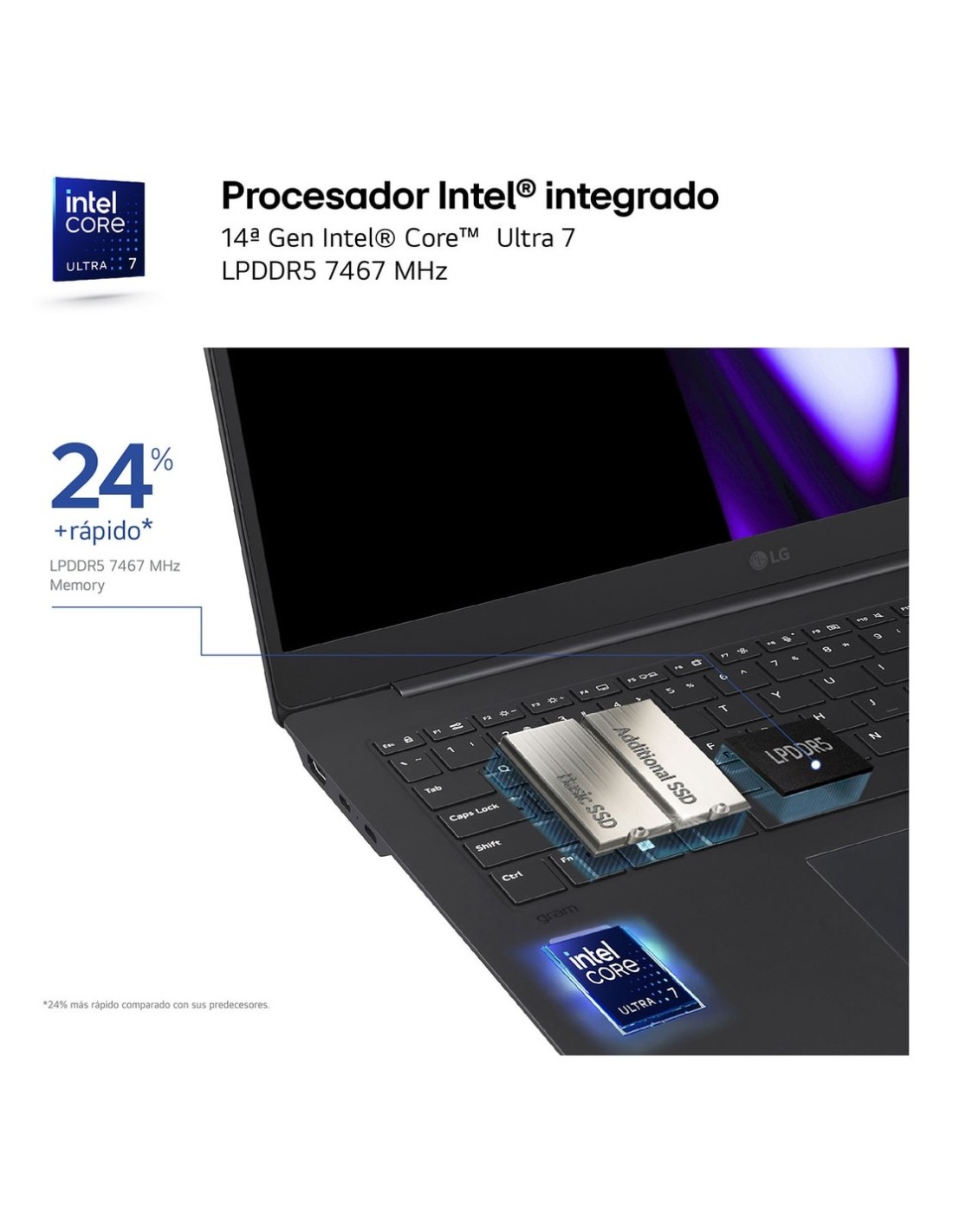 LG Gram Pro 16Z90SP, Intel Core Ultra 7, 1,4 GHz, 40,6 cm (16"), 2880 x 1800 Pixeles, 32 GB, 1 TB