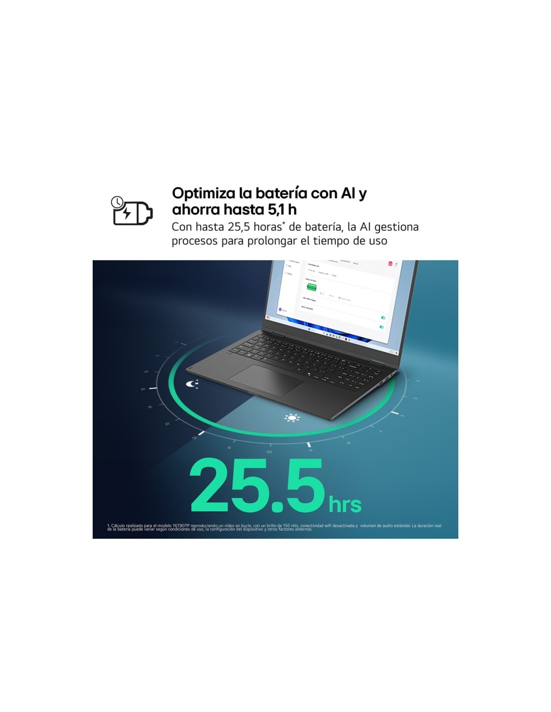 Alimentado por una batería de alta capacidad de 77 Wh que ofrece hasta 25,5 horas de tiempo de uso y equipado con nuestro Asistente con AI, gram analiza los patrones del usuario para optimizar la eficiencia de la batería. Aumenta tu productividad y disfruta del juego sin interrupciones.