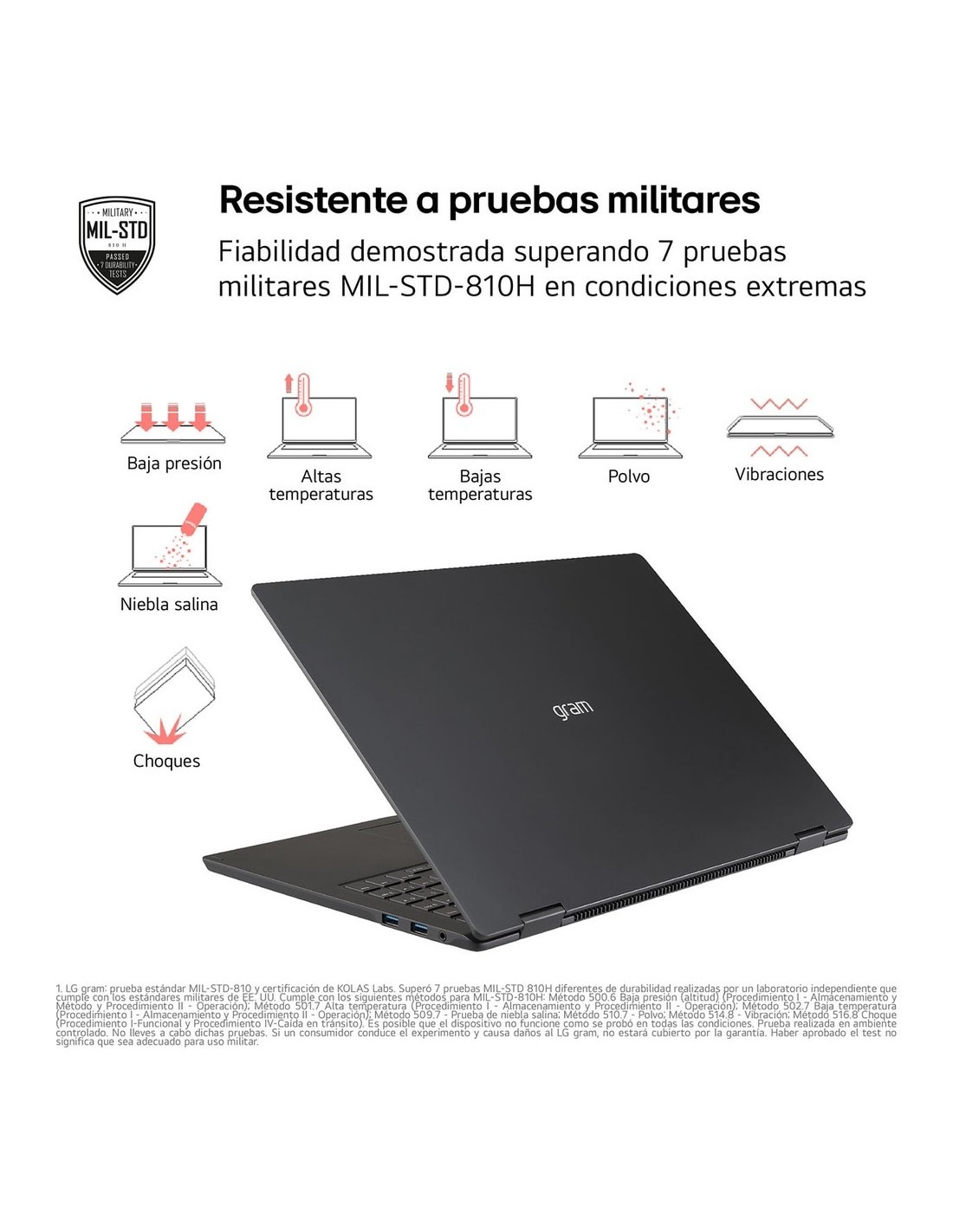 El LG gram Pro evoluciona con gram AI, pero su esencia delgada y ligera se mantiene fiel. Durabilidad validada por pruebas militares, ofrece la alegría de la ligereza y un valor ilimitado. Con una portabilidad mejorada, lleva tu mundo contigo a cualquier parte