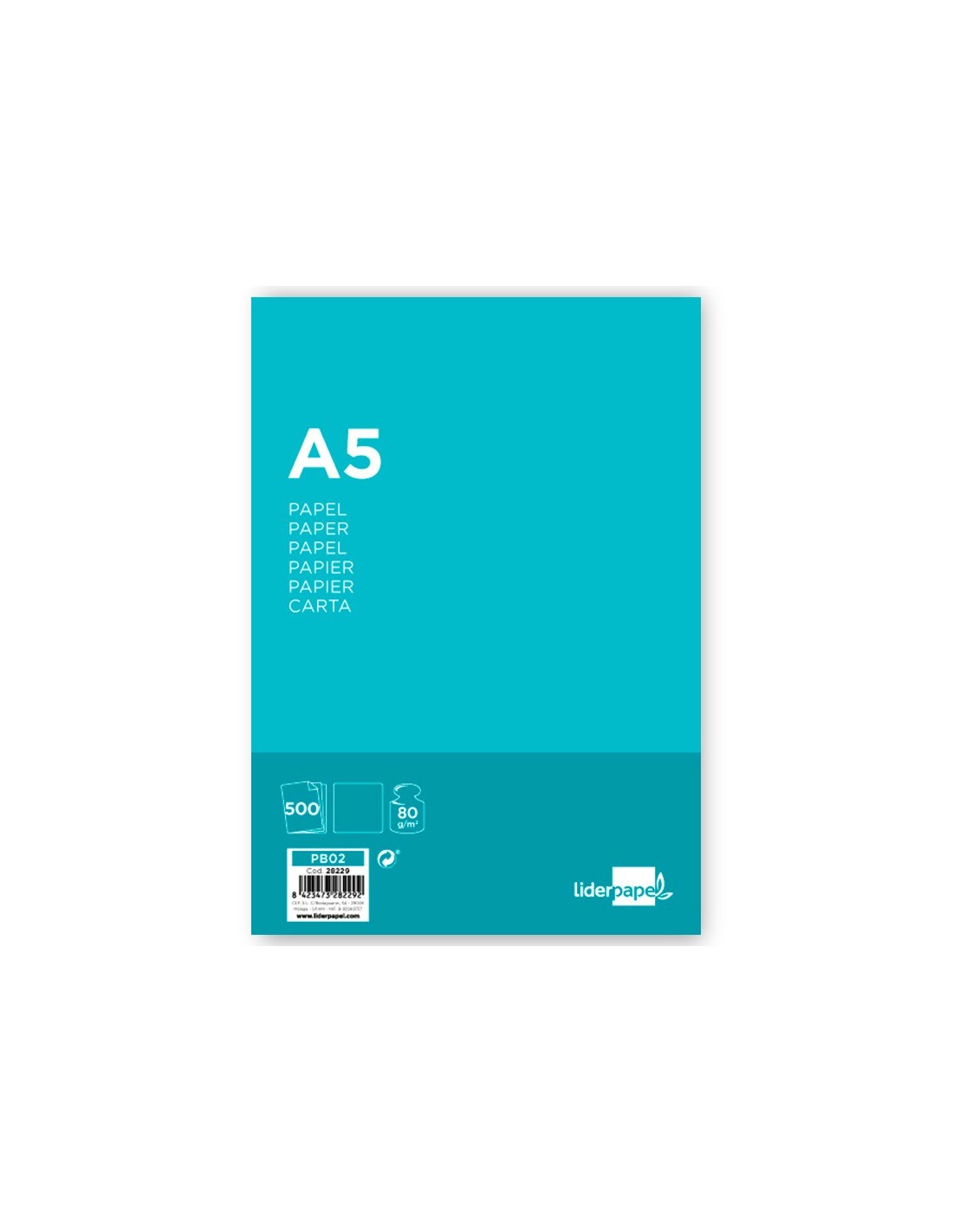 Liderpapel PB02. Uso recomendado: Para hacer copias, Tamaño del papel: A5 (148x210 mm), Tipo final: Alise. Ancho: 148,5 mm, Altura: 210 mm