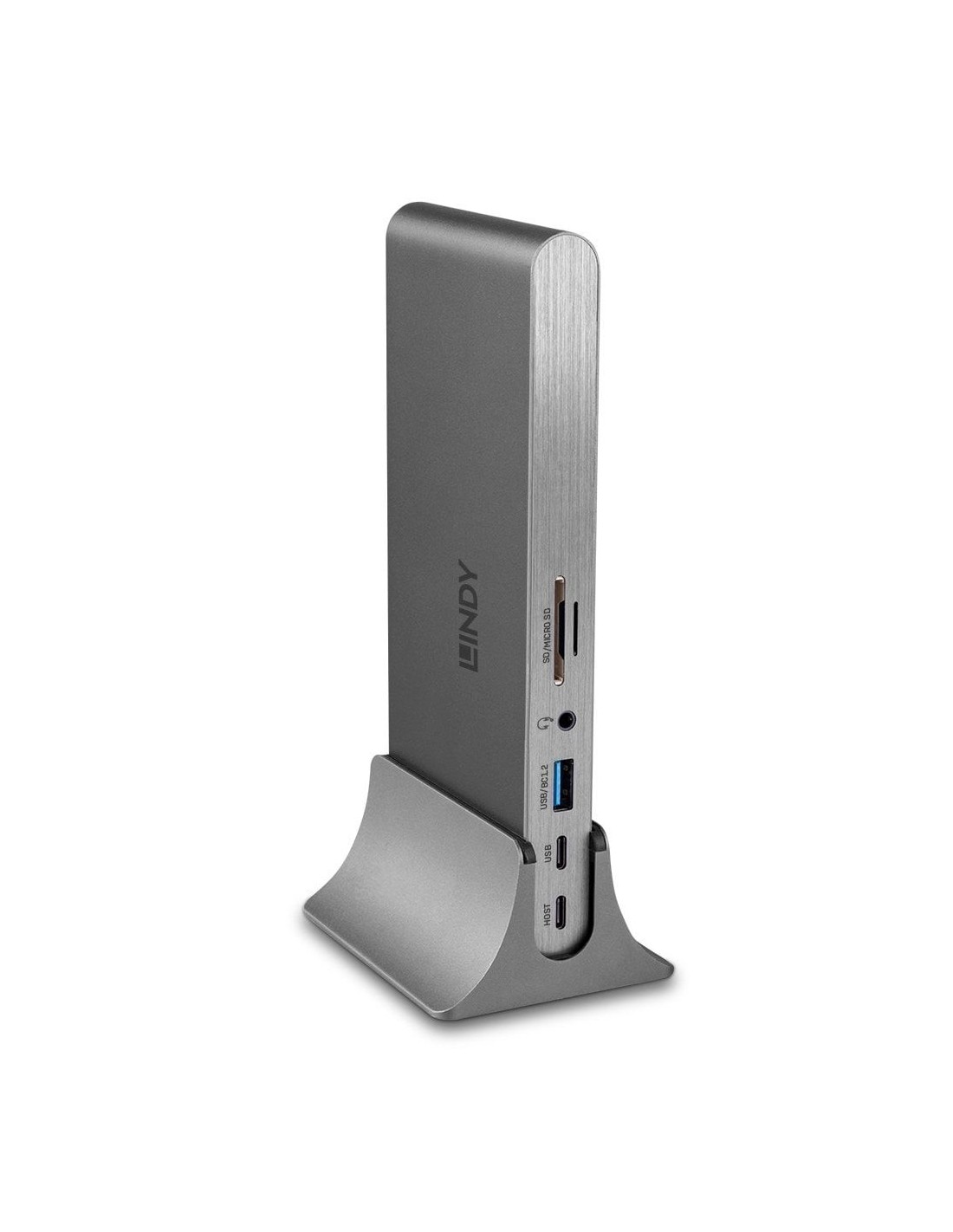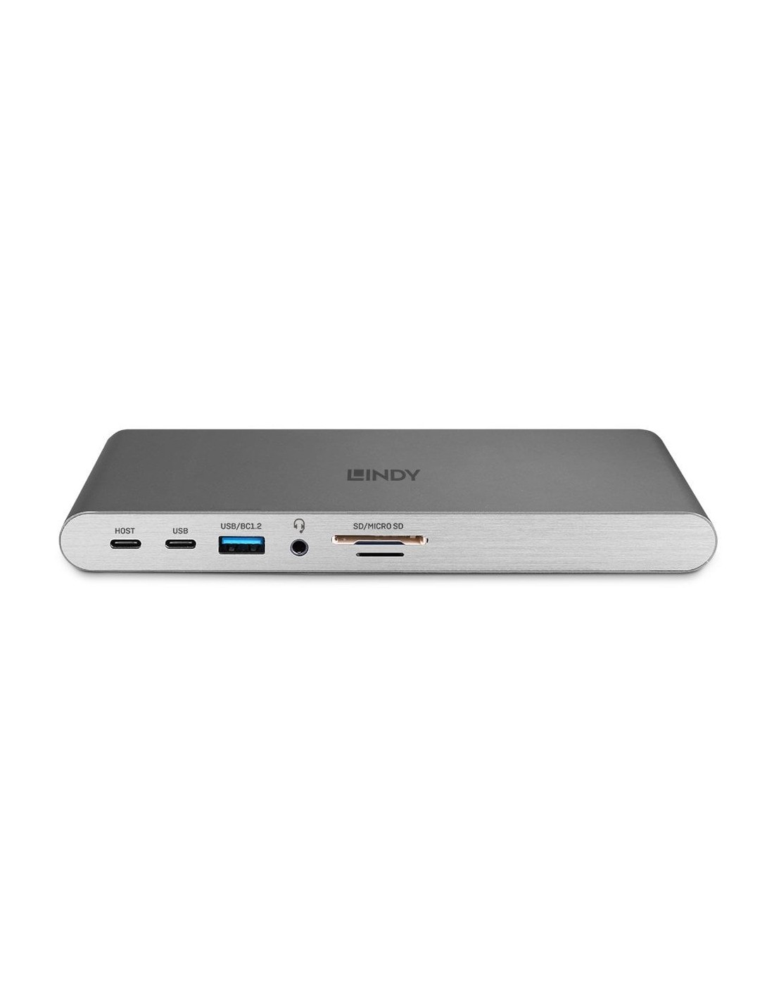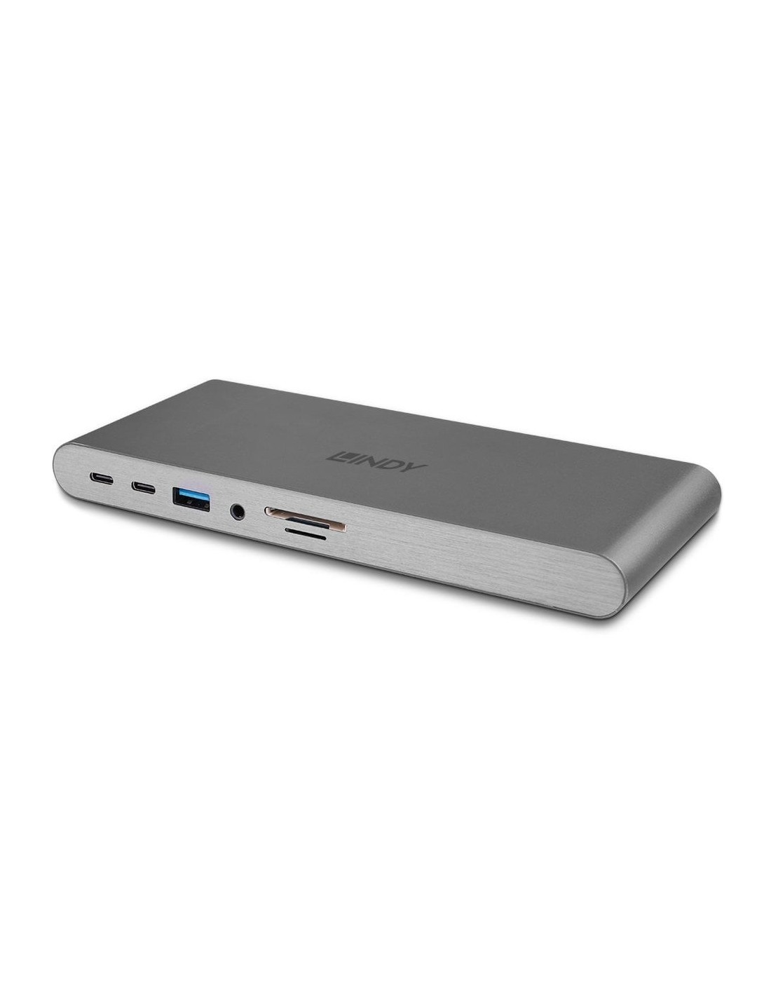 Lindy 43349. Tecnología de conectividad: Alámbrico, Interfaz de host: USB 3.2 Gen 1 (3.1 Gen 1) Type-C, Entrega de energía USB (USB Power Delivery) de hasta: 100 W. Ethernet LAN, velocidad de transferencia de datos: 10,100,1000 Mbit/s. Color del producto: Plata, Tarjetas de memoria compatibles: MicroSD (TransFlash), SD, Velocidad de transferencia de datos: 5 Gbit/s. Alimentación: CC, Conector eléctrico: USB Tipo C, Voltaje de salida: 20 V. Ancho: 180 mm, Profundidad: 77 mm, Altura: 18 mm