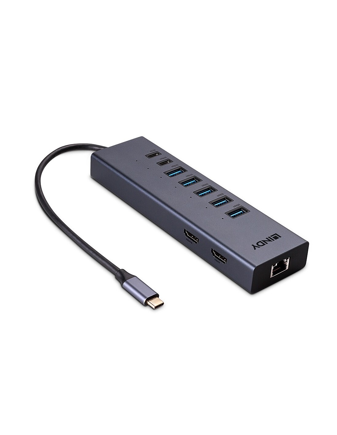 Lindy 43373. Tecnología de conectividad: Alámbrico, Interfaz de host: USB 3.2 Gen 2 (3.1 Gen 2) Type-C, Entrega de energía USB (USB Power Delivery) de hasta: 100 W. Ethernet LAN, velocidad de transferencia de datos: 10,100,1000 Mbit/s, Tecnología de cableado ethernet de cobre: 10BASE-T, 100BASE-TX, 1000BASE-T. Color del producto: Gris, Velocidad de transferencia de datos: 10 Gbit/s, Tipo HD: 8K Ultra HD. Alimentación: USB, Conector eléctrico: USB Tipo C, Longitud del cable: 0,22 m. Sistemas operativos móviles soportados: Android, Otros sistemas operativos soportados: ChromeOS