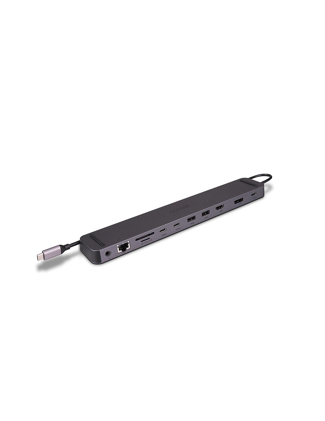 Lindy 43392. Tecnología de conectividad: Acoplamiento, Interfaz de host: USB 3.2 Gen 1 (3.1 Gen 1) Type-C, Entrega de energía USB (USB Power Delivery) de hasta: 100 W. Ethernet LAN, velocidad de transferencia de datos: 10,100,1000 Mbit/s. Color del producto: Antracita, Tarjetas de memoria compatibles: MicroSD (TransFlash), SD, Velocidad de transferencia de datos: 10 Gbit/s. Alimentación: USB, Conector eléctrico: USB Tipo C, Fuente de alimentación: 15 W. Ancho: 270 mm, Profundidad: 45 mm, Altura: 16 mm