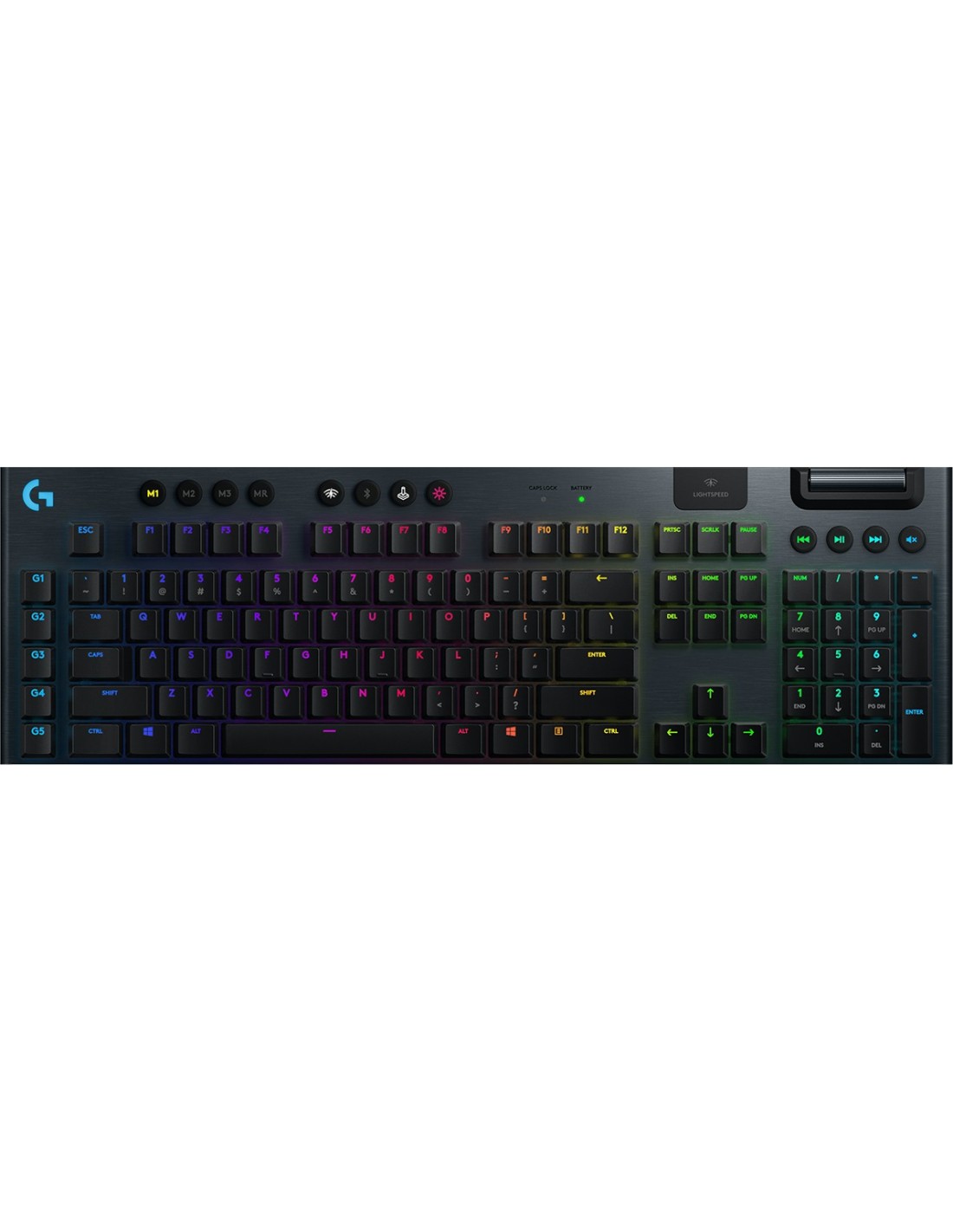 Logitech G G915. Formato del teclado: Completo (100%). Estilo de teclado: Derecho. Tecnología de conectividad: Inalámbrico, Interfaz del dispositivo: RF Wireless + Bluetooth, Interruptor del teclado: Interruptor mecánico. Tipo de retroiluminación: LED RGB. Longitud de cable: 1,8 m. Uso recomendado: Juego. Color del producto: Carbono