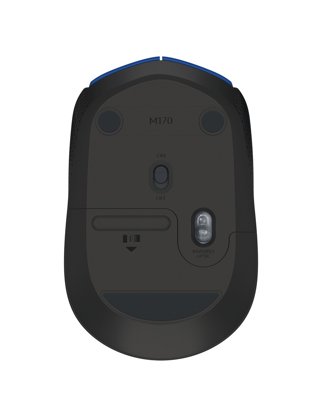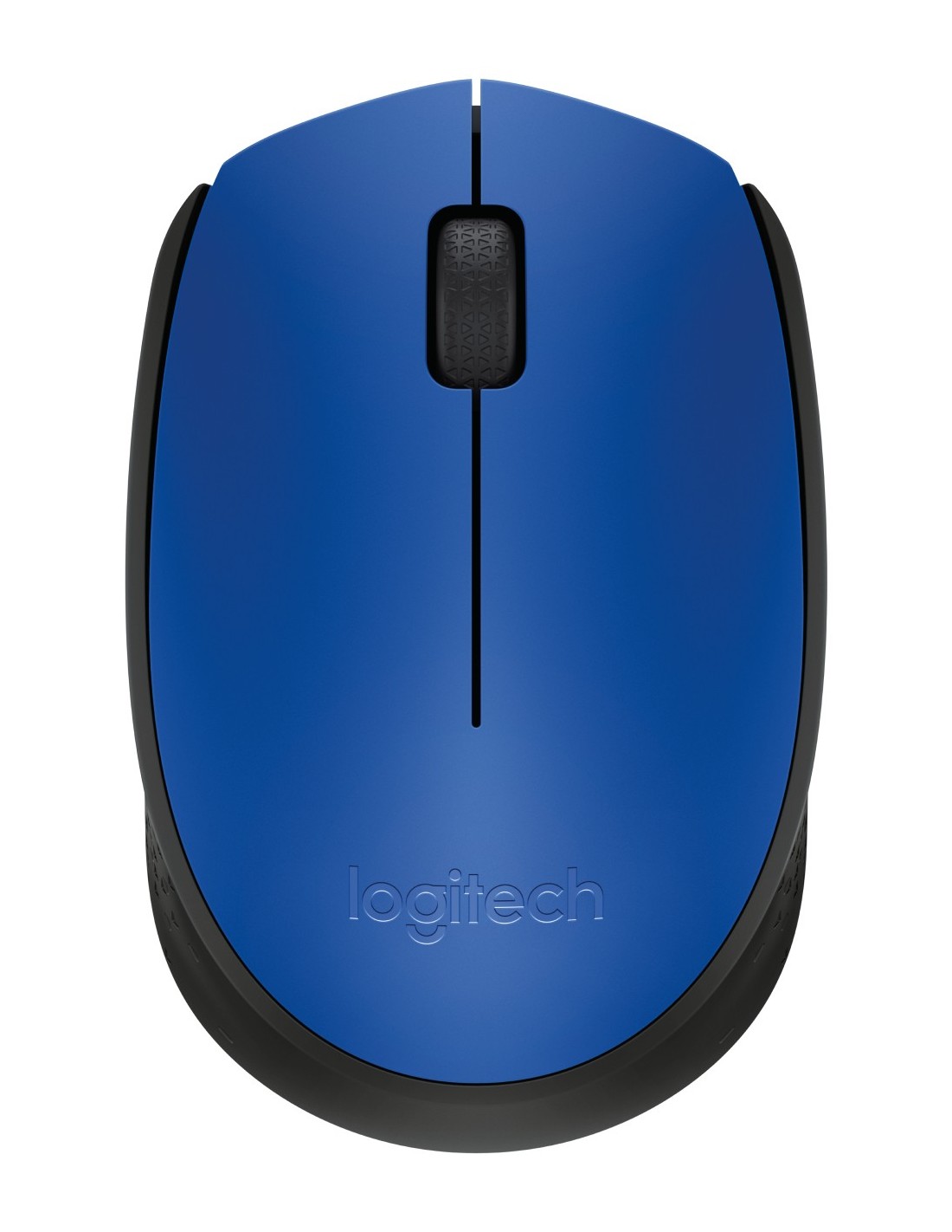 Logitech M171. Factor de forma: Ambidextro. Tecnología de detección de movimientos: Óptico, Interfaz del dispositivo: RF inalámbrico, Resolución de movimiento: 1000 DPI, Tipo de botones: Botones presionados, Cantidad de botones: 2, Tipo de desplazamiento: Rueda. Fuente de energía: Baterías. Color del producto: Negro, Azul