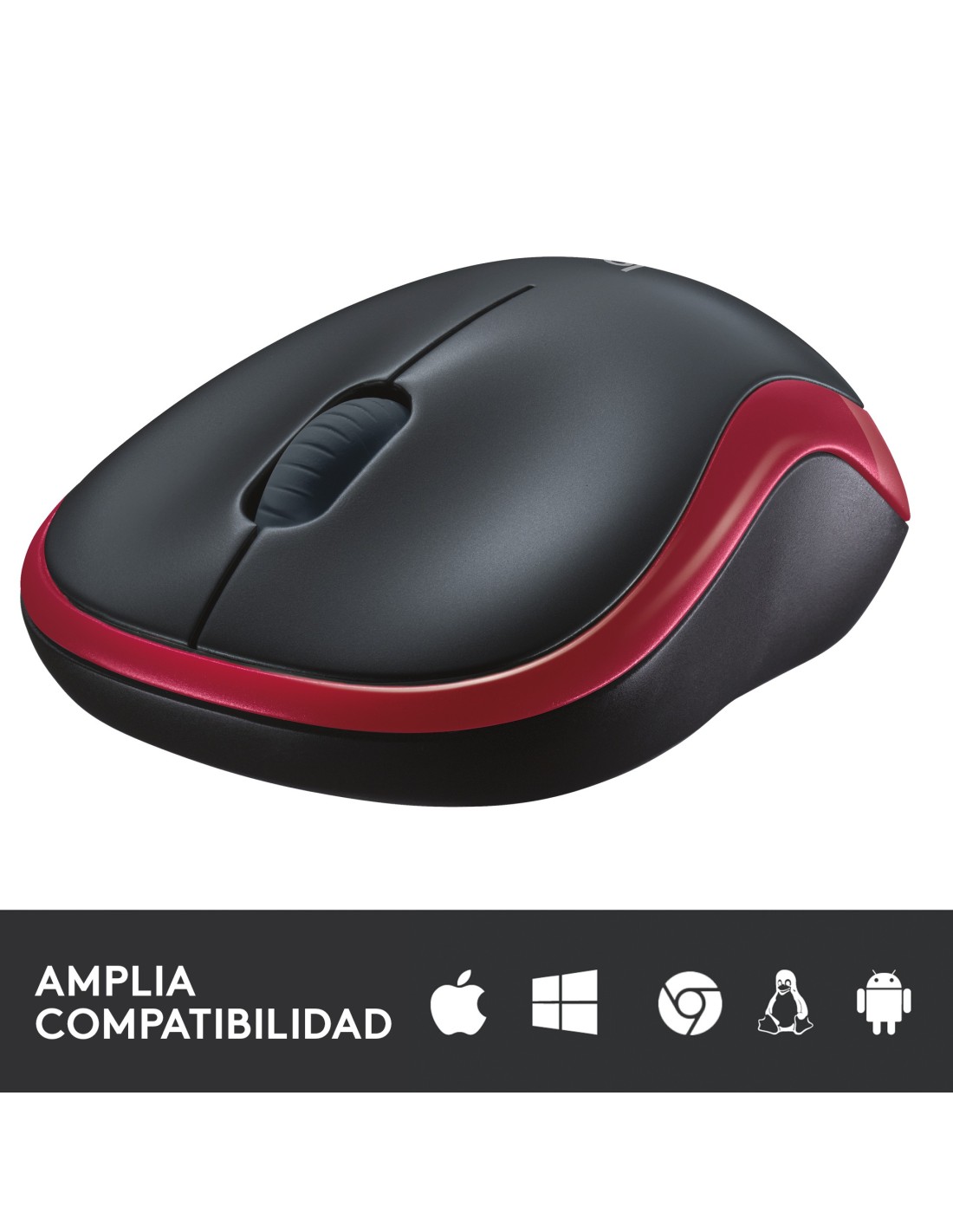 Logitech M185. Factor de forma: Ambidextro. Tecnología de detección de movimientos: Óptico, Interfaz del dispositivo: RF inalámbrico, Resolución de movimiento: 1000 DPI, Tipo de botones: Botones presionados, Cantidad de botones: 3, Tipo de desplazamiento: Rueda. Fuente de energía: Baterías. Color del producto: Rojo