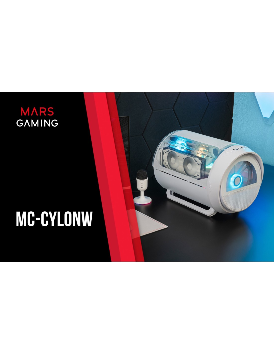 Mars Gaming MC-CYLONW. Factor de forma: Mini Tower, Tipo: PC, Color del producto: Blanco. Factores de forma de la fuente de alimentación compatibles: ATX. Ventiladores frontales instalados: 1x 200 mm, Diámetro de ventiladores frontales soportados: 200 mm, Ventiladores traseros instalados: 1x 120 mm. Tamaños de disco duro soportados: 2.5,3.5". Ancho: 325 mm, Profundidad: 460 mm, Altura: 330 mm