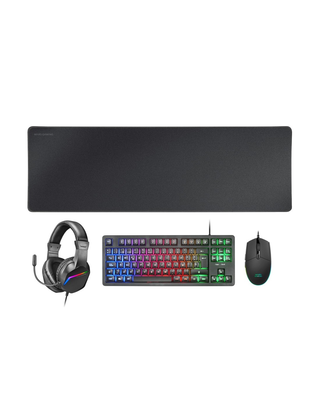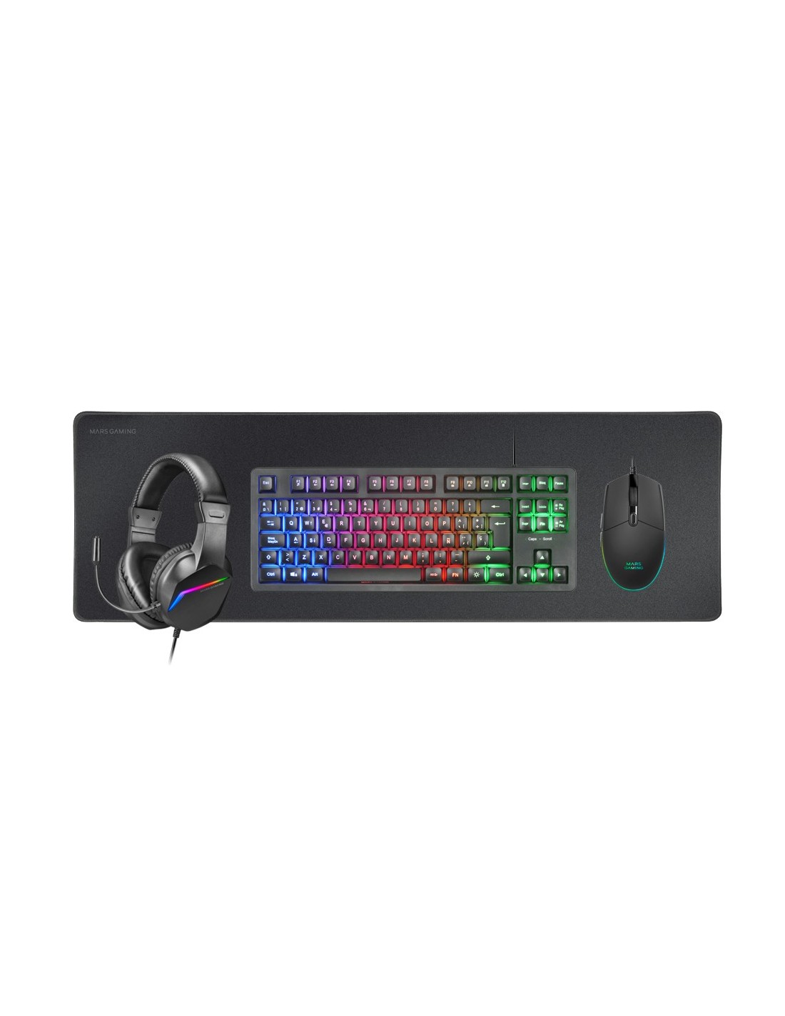 Mars Gaming MCP-RGB3, Pack Gaming Teclado Fixed RGB + Ratón Gaming RGB Flow 3200 DPI + Auriculares Over-Ear RGB + Alfombrilla XXL, Negro, Idioma Español, Alámbrico, USB, Interruptor de membrana, QWERTY, LED RGB, Negro