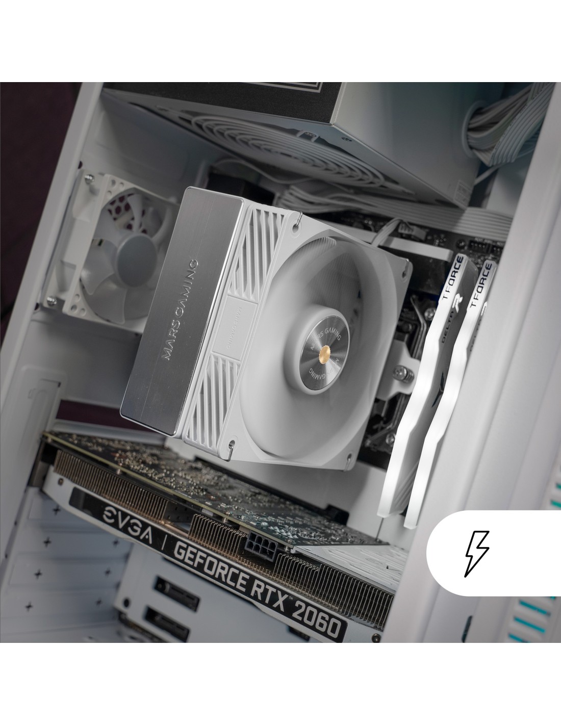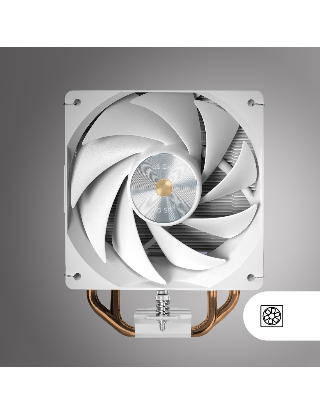 Mars Gaming MCPU-X4W. Tipo: Refrigerador de aire, Diámetro de ventilador: 12 cm, Presión de aire mínima: 0,79 mmH2O, Presión máxima de aire: 1,31 mmH2O, Tipo de soporte: Hidráulico. Ancho: 120 mm, Profundidad: 68 mm, Altura: 154 mm. Color del producto: Blanco