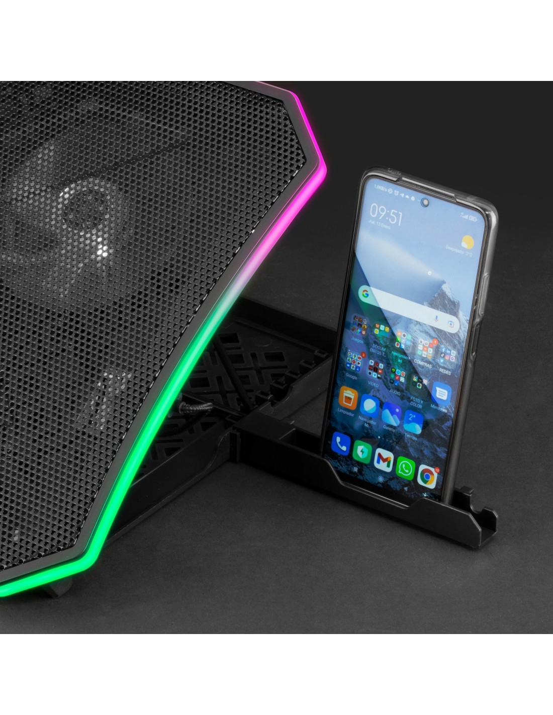 Base y stand de refrigeración Premium para portátiles avanzados. Todo lo que puedas desear a tu alcance: espectacular iluminación ARGB dinámica controlable, gran tamaño XL para soportar los portátiles más potentes, refrigeración extrema con 3 grandes ventiladores controlados digitalmente, función stand con 7 posiciones seleccionables y un exclusivo stand para tu smartphone.