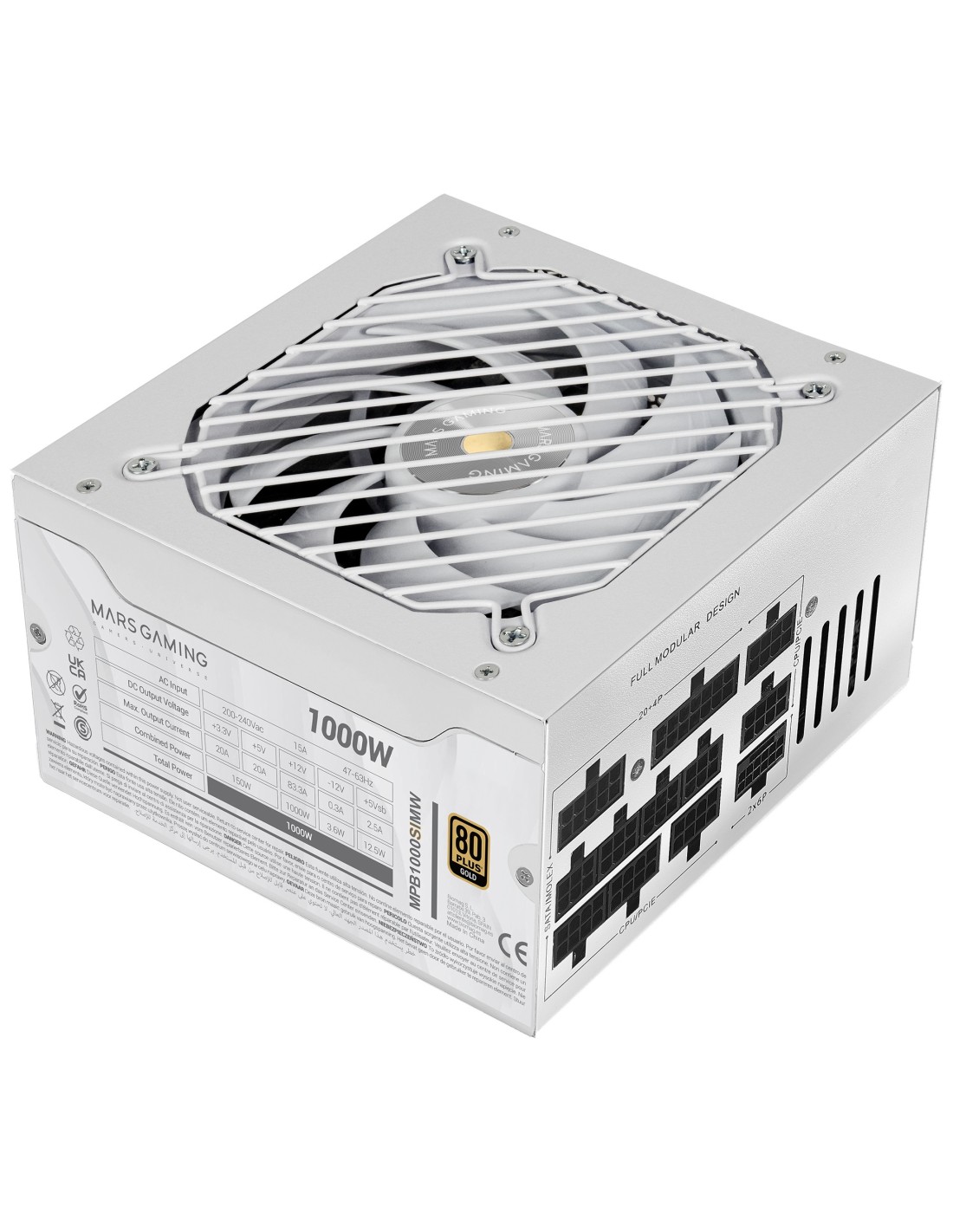 Mars Gaming MPB1000SIMW. Potencia total: 1000 W, Voltaje de entrada AC: 220 - 240 V, Frecuencia de entrada AC: 47 - 63 Hz. Alimentador de energía para tarjeta madre: 24-pin ATX, Tipo de cableado: Totalmente modular. Utilizar con: PC, Factor de forma de fuente de alimentación (PSU): ATX, Certificación 80 PLUS: 80 PLUS Gold. Color del producto: Blanco, Tipo de enfriamiento: Activo, Diámetro de ventilador: 14 cm. Cables incluidos: CPU, PCIe, Peripheral (Molex), SATA