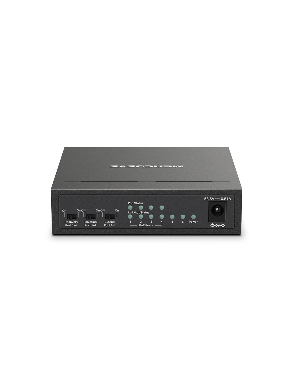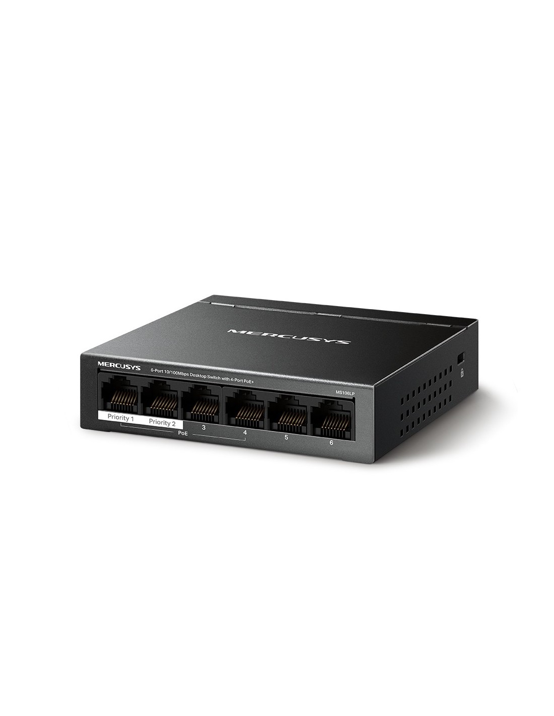 Mercusys MS106LP. Tipo de interruptor: Gestionado. Puertos tipo básico de conmutación RJ-45 Ethernet: Fast Ethernet (10/100), Cantidad de puertos básicos de conmutación RJ-45 Ethernet: 6. Tabla de direcciones MAC: 2000 entradas. Estándares de red: IEEE 802.3af, IEEE 802.3at, IEEE 802.3x. Energía sobre Ethernet (PoE). Montaje de pared