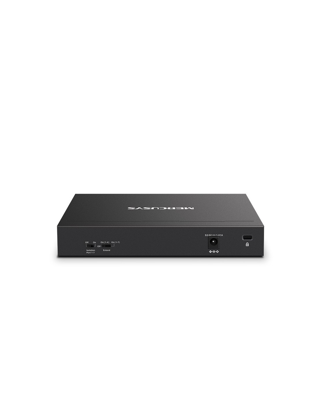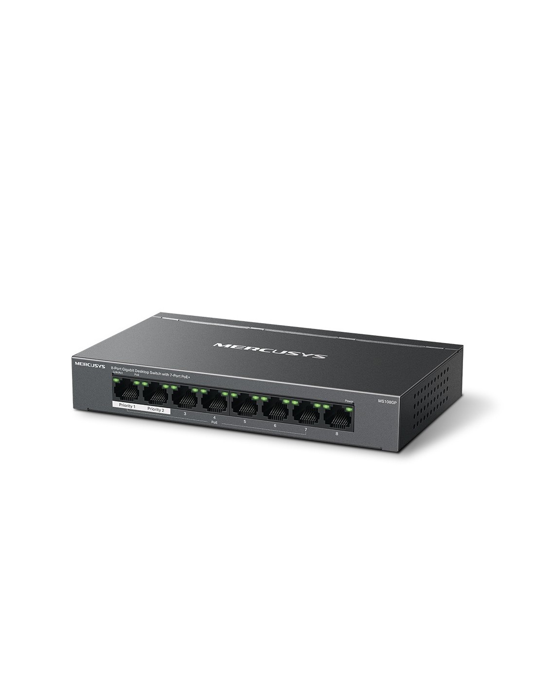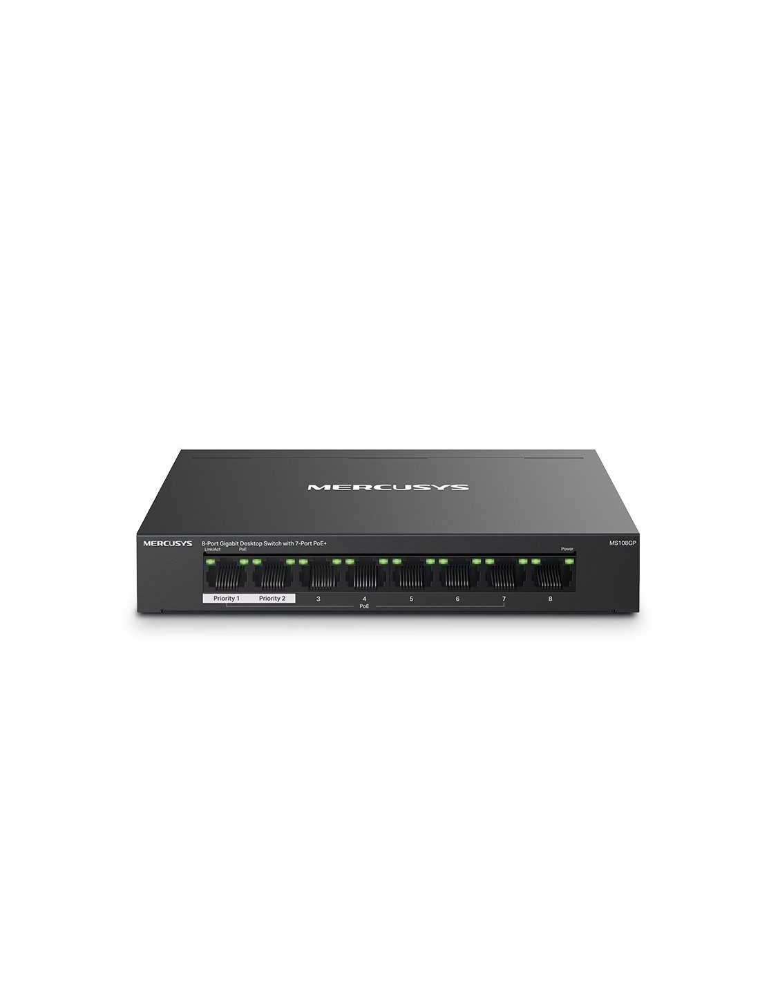 Mercusys MS108GP. Tipo de interruptor: Gestionado. Puertos tipo básico de conmutación RJ-45 Ethernet: Gigabit Ethernet (10/100/1000), Cantidad de puertos básicos de conmutación RJ-45 Ethernet: 8. Bidireccional completo (Full duplex). Tabla de direcciones MAC: 8000 entradas. Estándares de red: IEEE 802.3af, IEEE 802.3at, IEEE 802.3x. Energía sobre Ethernet (PoE). Montaje de pared