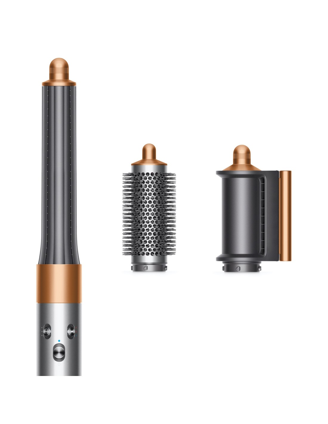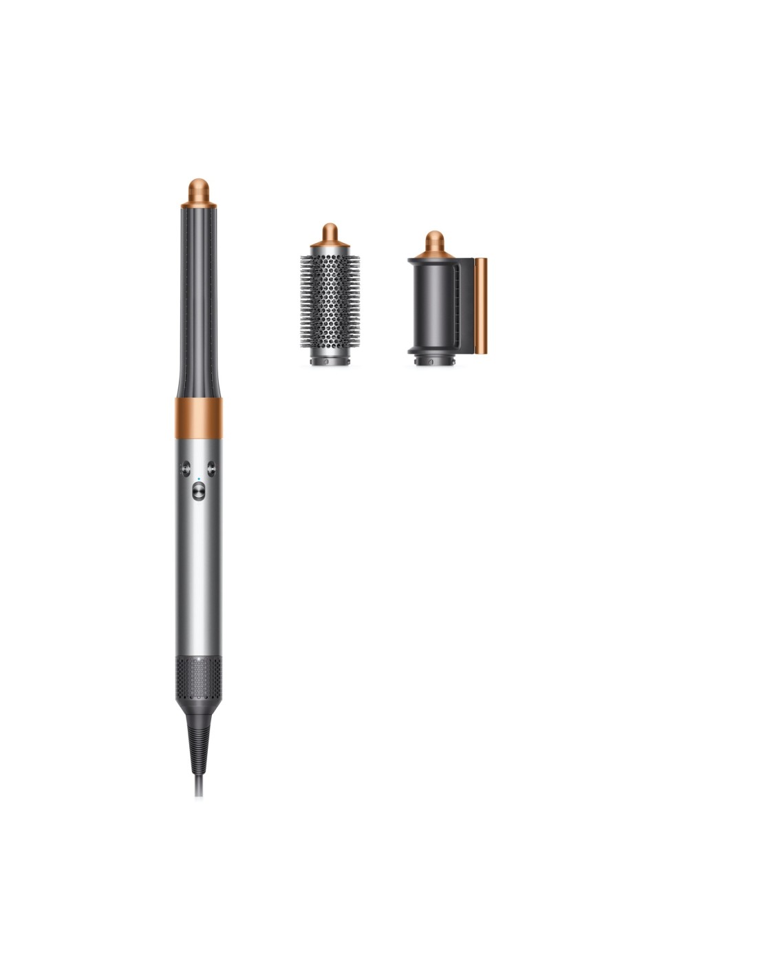 Dyson Airwrap Origin. Tipo: Herramienta de peinado con múltiples accesorios, Tecnología: Caliente, Forma del rizador de pelo: Con forma de cono. Color del producto: Cobre, Níquel. Longitud del cable: 2,675 m. Potencia: 1300 W, Voltaje de entrada AC: 120 V. Ancho: 272 mm, Profundidad: 48 mm, Altura: 41 mm