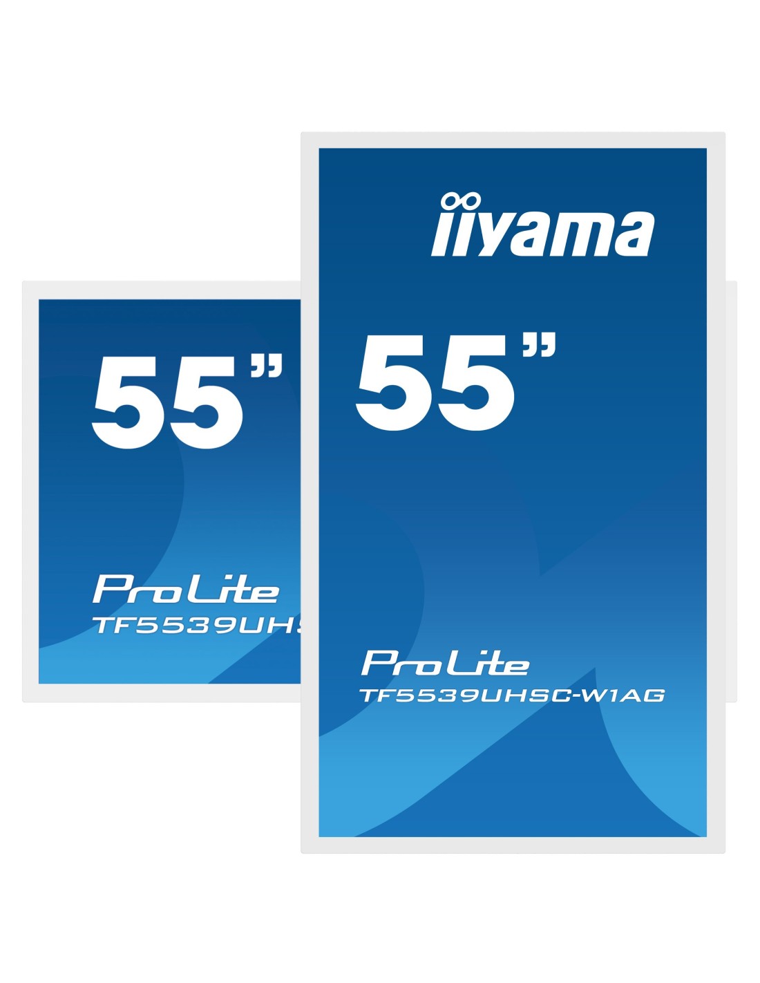 iiyama ProLite TF5539UHSC-W1AG. Diagonal de la pantalla: 139,7 cm (55"), Resolución de la pantalla: 3840 x 2160 Pixeles, Tipo HD: 4K Ultra HD, Tecnología de visualización: LED, Tiempo de respuesta: 8 ms, Relación de aspecto nativa: 16:9, Ángulo de visión, horizontal: 178°, Ángulo de visión, vertical: 178°. Altavoces incorporados. montaje VESA. Color del producto: Blanco