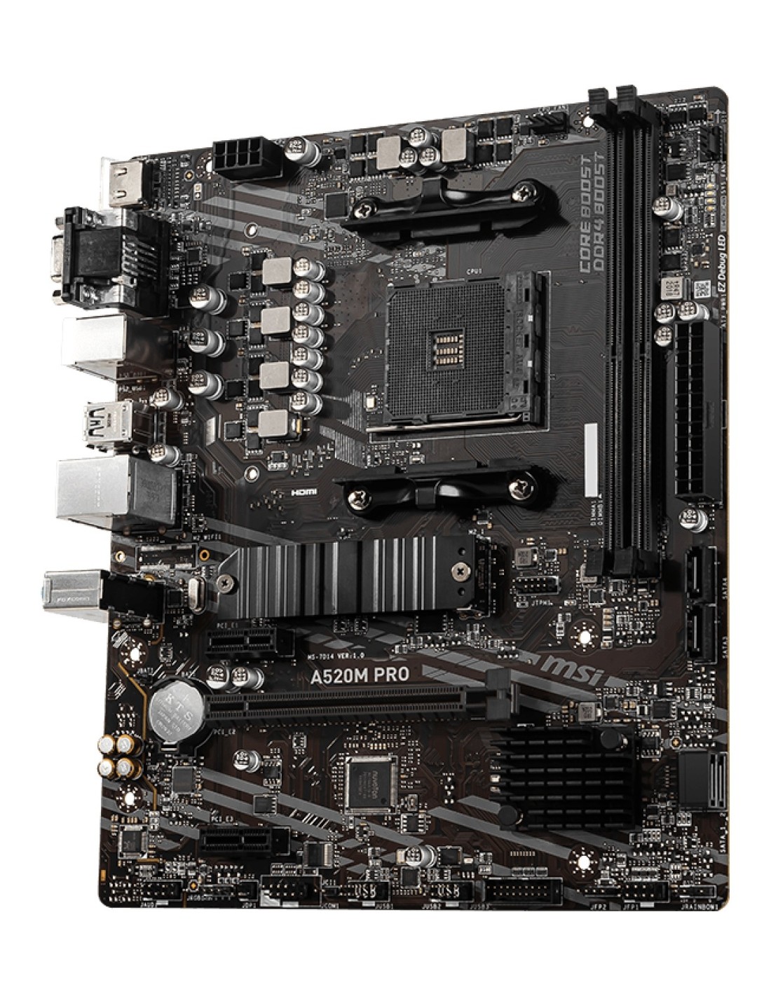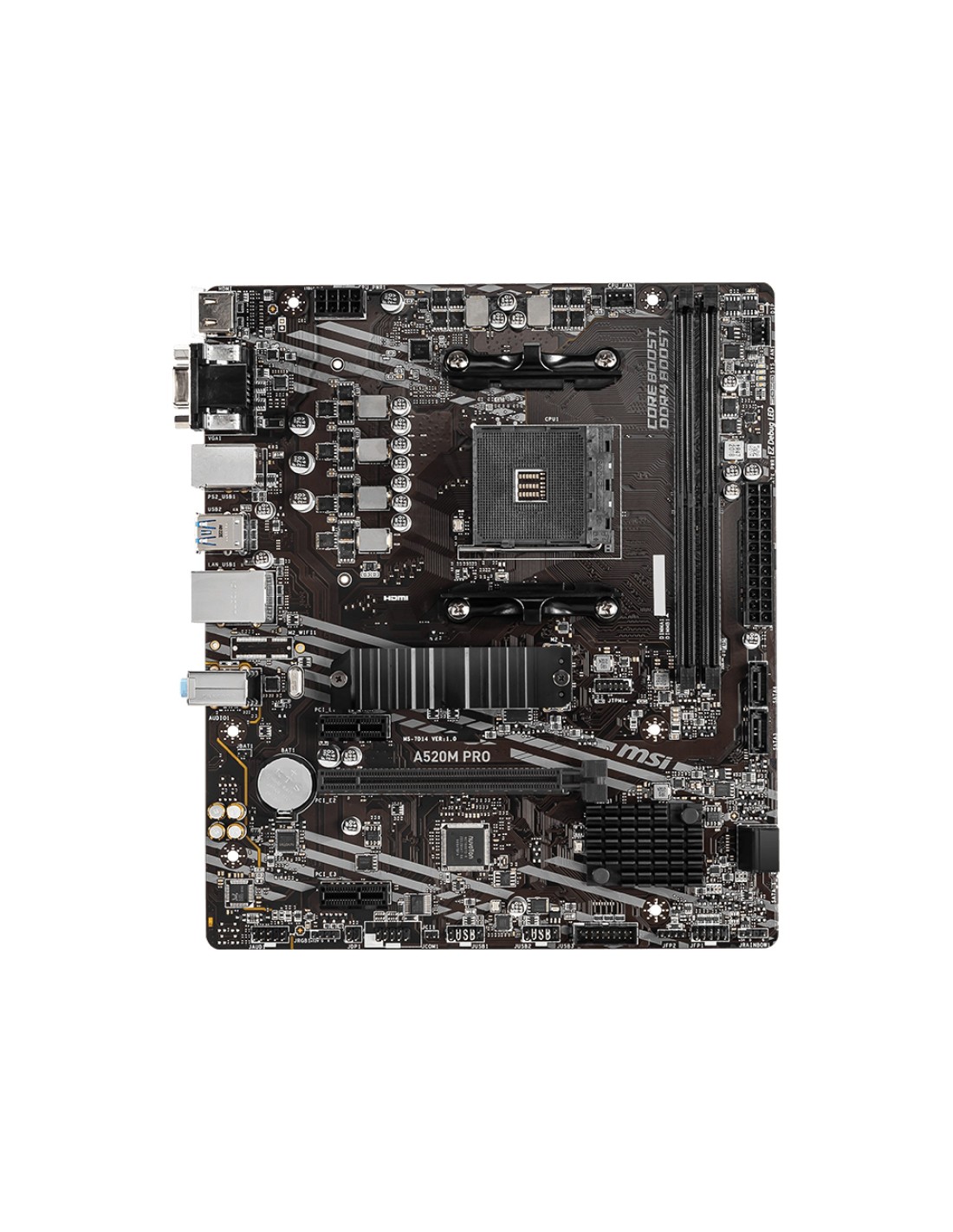 MSI A520M PRO. Fabricante de procesador: AMD, Socket de procesador: Zócalo AM4, Procesador compatible: AMD Ryzen 3000 Series. tipos de memoria compatibles: DDR4-SDRAM, Memoria interna máxima: 64 GB, Tipo de ranuras de memoria: DIMM. Interfaces de disco de almacenamiento soportados: PCI Express 3.0, SATA, Tipos de unidades de almacenamiento admitidas: HDD & SSD, Niveles RAID: 0, 1, 10. Máxima resolución: 4096 x 2160 Pixeles. Tipo de interfaz ethernet: Gigabit Ethernet, Controlador LAN: Realtek 8111H