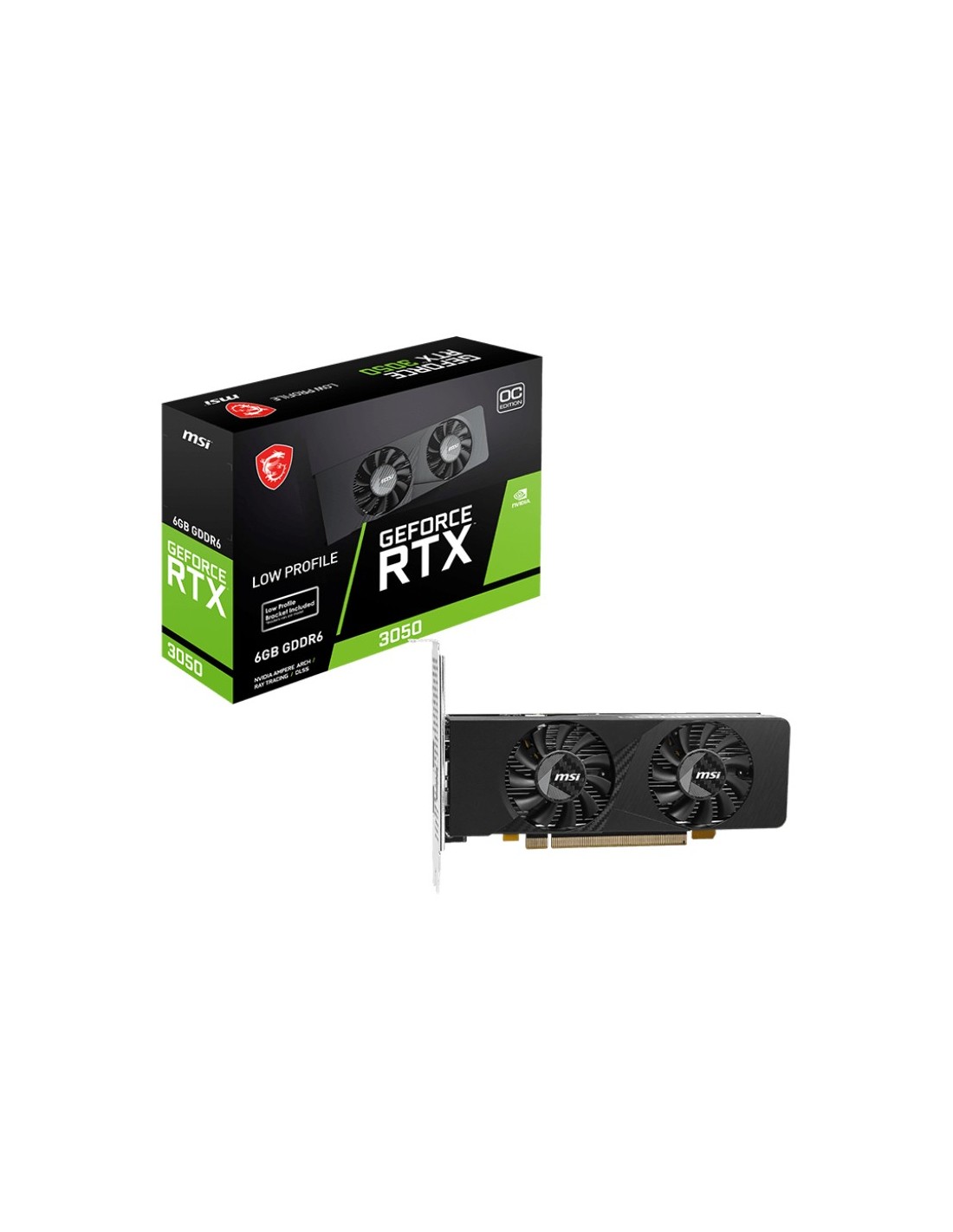 MSI GEFORCE RTX 3050 LP E 6G OC. Familia de procesadores de gráficos: NVIDIA, Procesador gráfico: GeForce RTX 3050. Capacidad memoria de adaptador gráfico: 6 GB, Tipo de memoria de adaptador gráfico: GDDR6, Ancho de datos: 96 bit. Máxima resolución: 7680 x 4320 Pixeles. Versión DirectX: 12 Ultimate, Versión OpenGL: 4.6. Tipo de interfaz: PCI Express x8 4.0. Tipo de enfriamiento: Activo, Número de ventiladores: 2 Ventilador(es)
