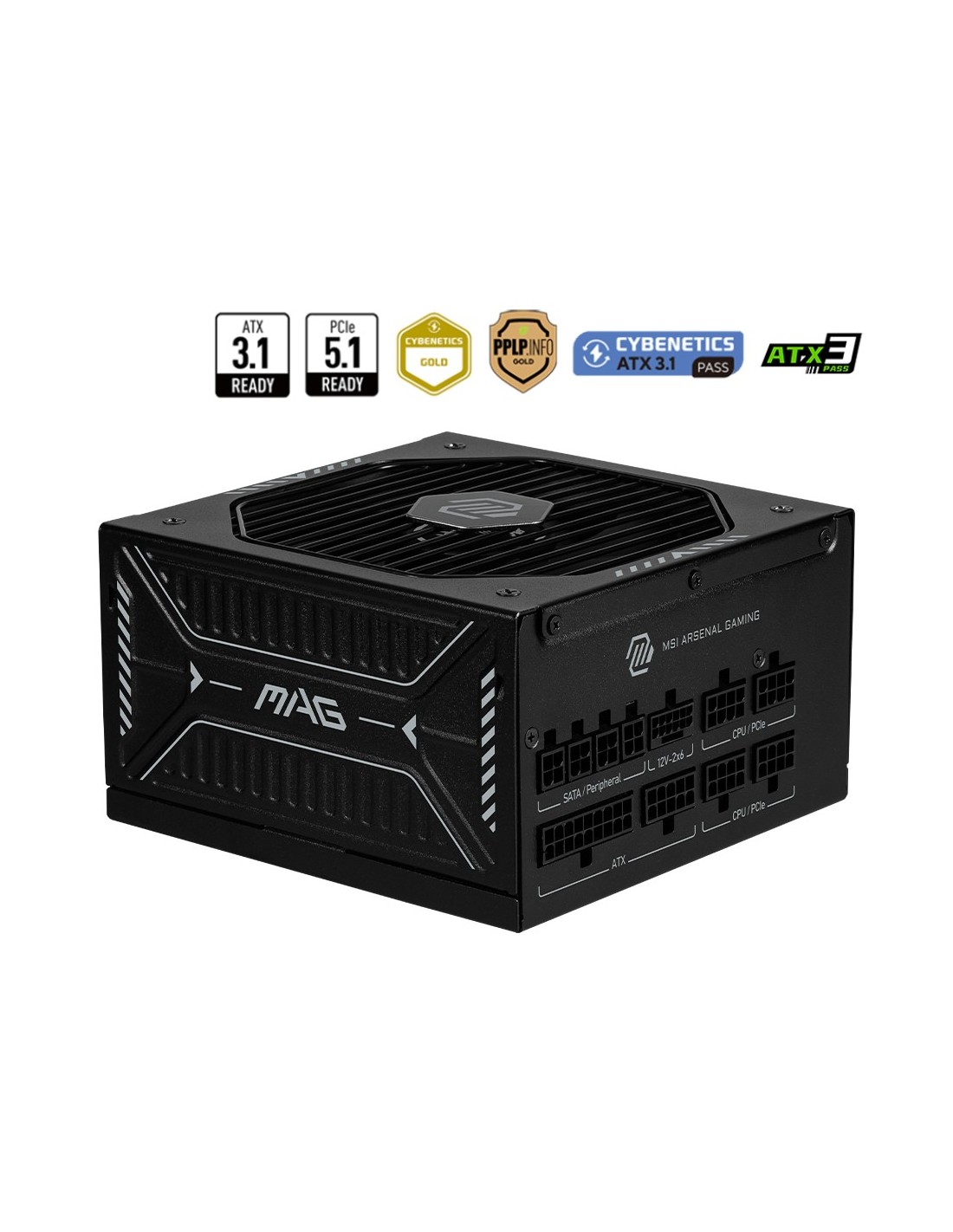 MSI MAG A850GLS PCIE5. Potencia total: 850 W, Voltaje de entrada AC: 100 - 240 V, Máxima energía: 1870 W. Alimentador de energía para tarjeta madre: 24-pin ATX, Tipo de cableado: Totalmente modular. Utilizar con: PC, Factor de forma de fuente de alimentación (PSU): ATX, Certificación 80 PLUS: 80 PLUS Gold. Color del producto: Negro, Diámetro de ventilador: 13,5 cm, Número de ventiladores: 1 Ventilador(es). Ancho: 150 mm, Profundidad: 150 mm, Altura: 86 mm