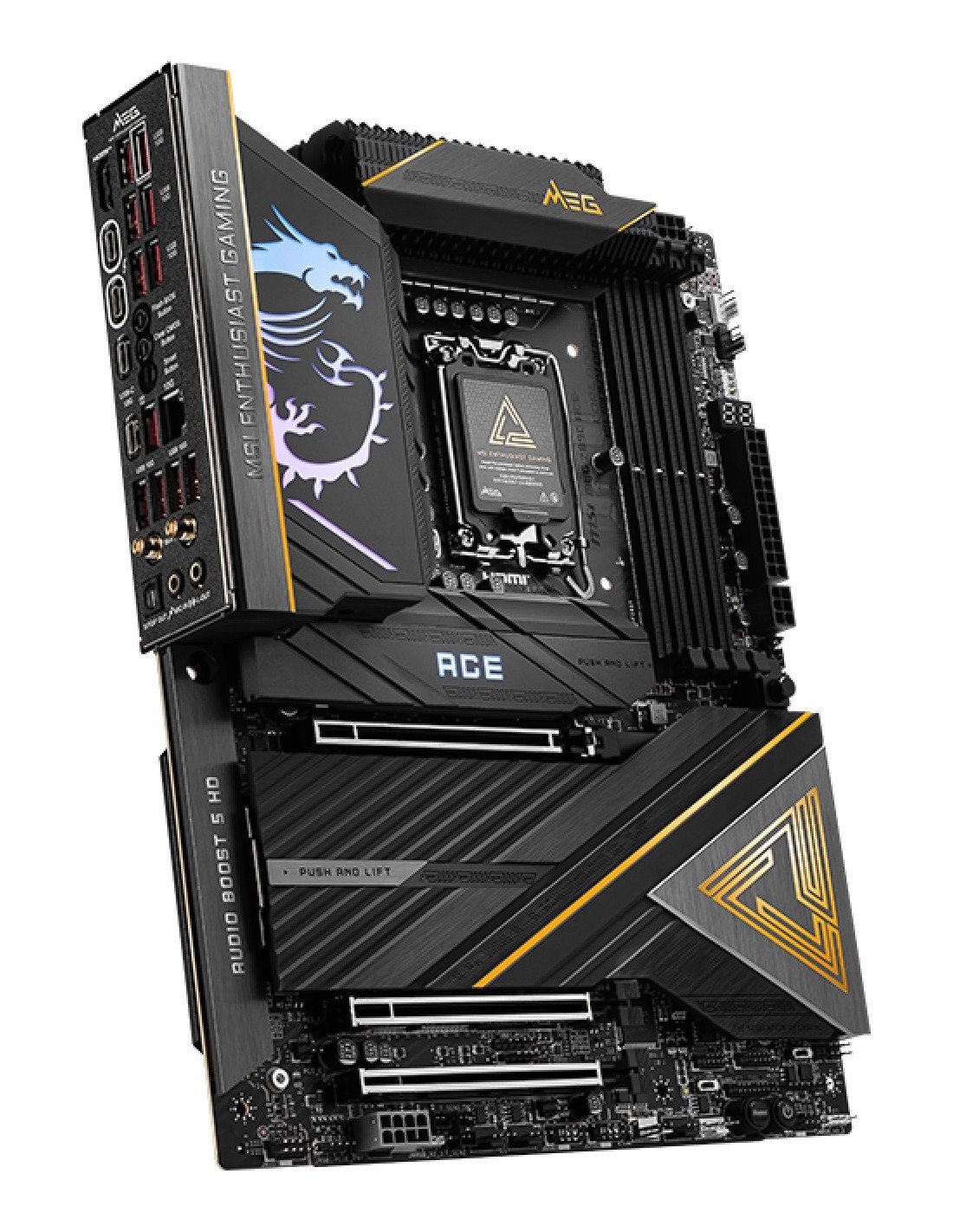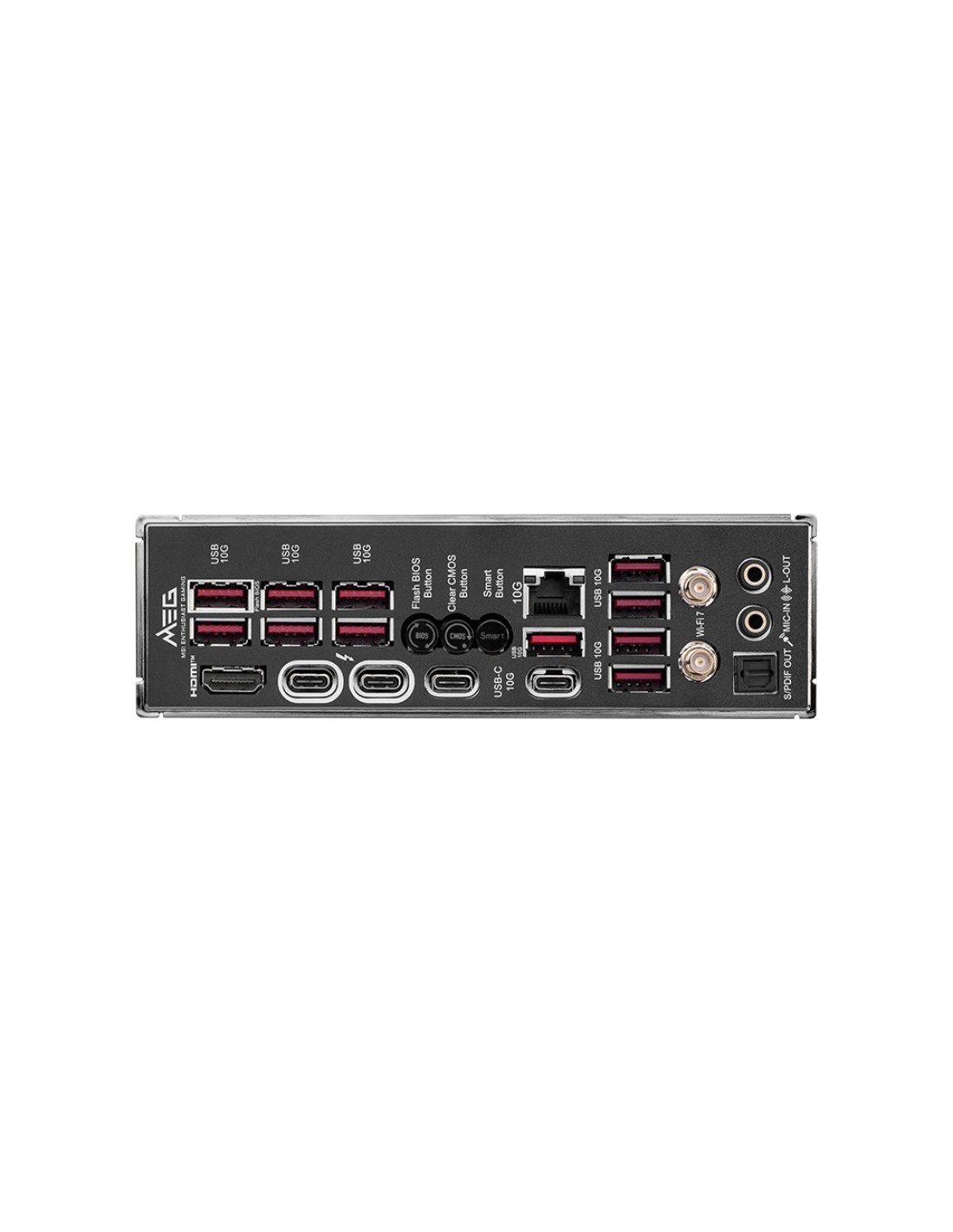 MSI MEG Z890 ACE. Fabricante de procesador: Intel, Socket de procesador: LGA 1851 (Socket V1), Procesador compatible: Intel Core Ultra (Series 2). tipos de memoria compatibles: DDR5-SDRAM, Memoria interna máxima: 256 GB, Tipo de ranuras de memoria: DIMM. Interfaces de disco de almacenamiento soportados: M.2, SATA III, Tipos de unidades de almacenamiento admitidas: HDD & SSD, Niveles RAID: 0, 5, 10. Tipo de interfaz ethernet: 10 Gigabit Ethernet, Estándar Wi-Fi: Wi-Fi 7 (802.11be), Wi-Fi estándares: 802.11a, 802.11b, 802.11g, Wi-Fi 4 (802.11n), Wi-Fi 5 (802.11ac), Wi-Fi 6 (802.11ax), Wi-Fi 6E.... Componente para: PC, Factor de forma: ATX, Familia del chipset: Intel