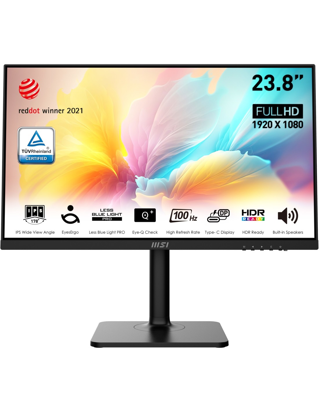 MSI Modern MD2412P. Diagonal de la pantalla: 60,5 cm (23.8"), Resolución de la pantalla: 1920 x 1080 Pixeles, Tipo HD: Full HD, Tecnología de visualización: LED, Tiempo de respuesta: 1 ms, Relación de aspecto nativa: 16:9, Ángulo de visión, horizontal: 178°, Ángulo de visión, vertical: 178°. Altavoces incorporados. montaje VESA, Ajustes de altura. Color del producto: Negro