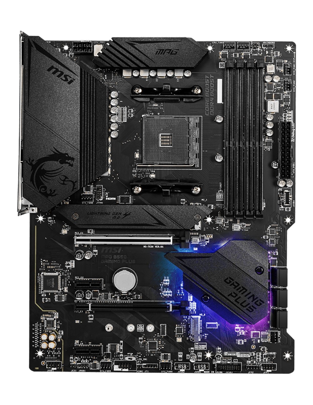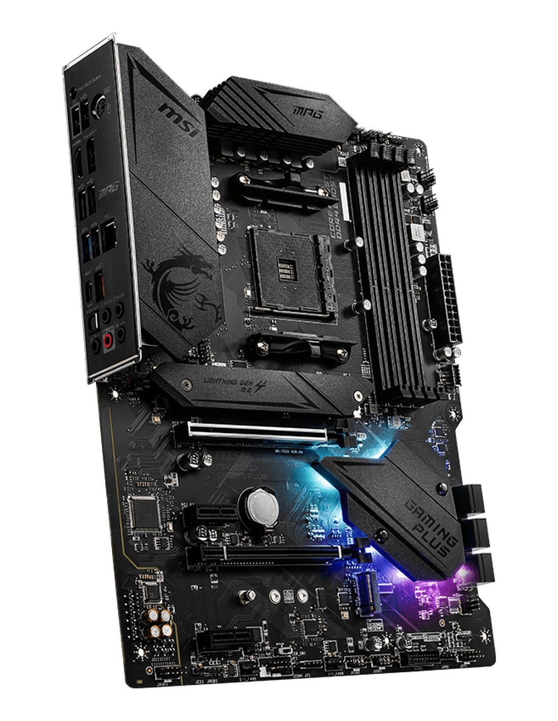 MSI MPG B550 Gaming Plus. Fabricante de procesador: AMD, Socket de procesador: Zócalo AM4, Procesador compatible: AMD Ryzen 3000 Series. tipos de memoria compatibles: DDR4-SDRAM, Memoria interna máxima: 128 GB, Tipo de ranuras de memoria: DIMM. Interfaces de disco de almacenamiento soportados: SATA III, Tipos de unidades de almacenamiento admitidas: HDD & SSD, Niveles RAID: 0, 1, 10. Soporte para proceso paralelo: 2-Way CrossFireX, Memoria máxima de adaptador de gráficos: 16000 MB, Máxima resolución: 4096 x 2160 Pixeles. Tipo de interfaz ethernet: Gigabit Ethernet, Controlador LAN: Realtek 8111H