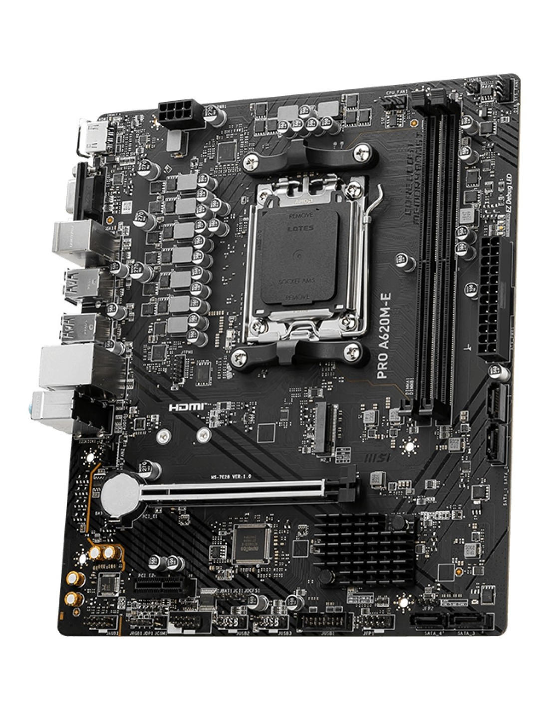 MSI PRO A620M-E. Fabricante de procesador: AMD, Socket de procesador: Zócalo AM5, Procesador compatible: AMD Ryzen™ 7. tipos de memoria compatibles: DDR5-SDRAM, Memoria interna máxima: 96 GB, Tipo de ranuras de memoria: DIMM. Interfaces de disco de almacenamiento soportados: M.2, PCI Express, SATA, Tipos de unidades de almacenamiento admitidas: HDD & SSD, Niveles RAID: 0, 1, 10. Máxima resolución: 3840 x 2160 Pixeles. Conector USB: USB tipo A