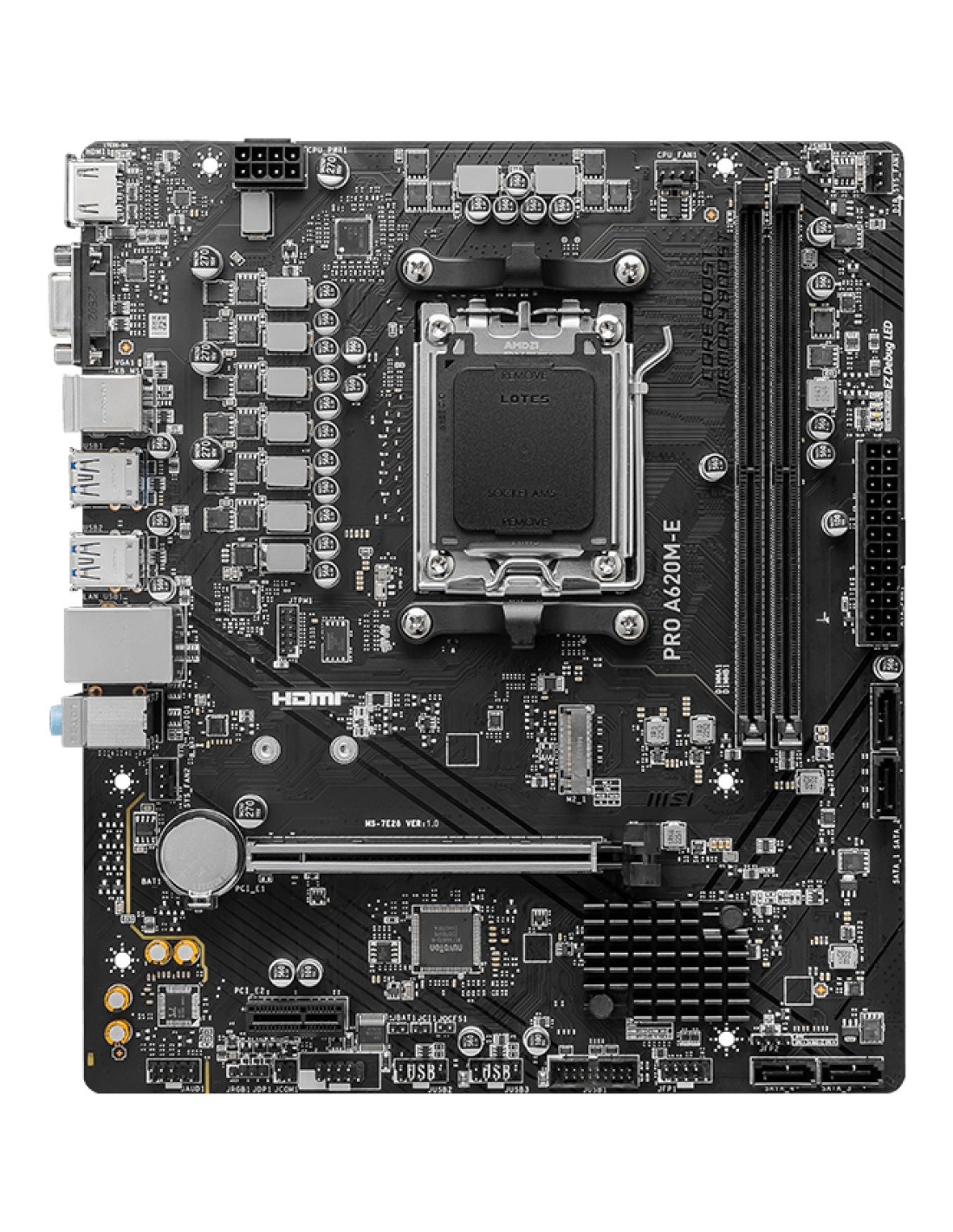 MSI PRO A620M-E. Fabricante de procesador: AMD, Socket de procesador: Zócalo AM5, Procesador compatible: AMD Ryzen™ 7. tipos de memoria compatibles: DDR5-SDRAM, Memoria interna máxima: 96 GB, Tipo de ranuras de memoria: DIMM. Interfaces de disco de almacenamiento soportados: M.2, PCI Express, SATA, Tipos de unidades de almacenamiento admitidas: HDD & SSD, Niveles RAID: 0, 1, 10. Máxima resolución: 3840 x 2160 Pixeles. Conector USB: USB tipo A