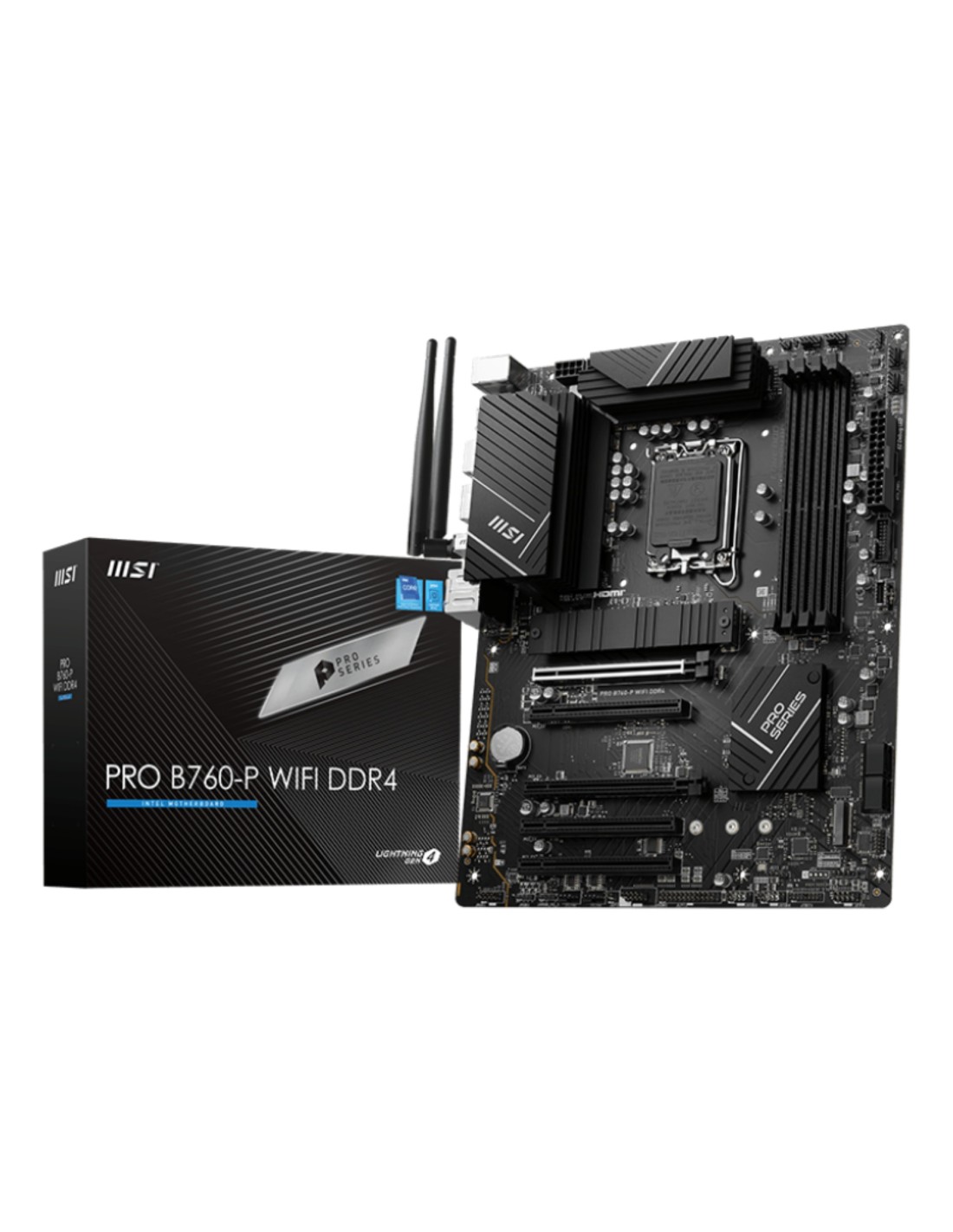 MSI PRO B760-P WIFI DDR4. Fabricante de procesador: Intel, Socket de procesador: LGA 1700, Procesador compatible: Intel® Celeron®, Intel® Pentium® Gold. tipos de memoria compatibles: DDR4-SDRAM, Memoria interna máxima: 128 GB, Tipo de ranuras de memoria: DIMM. Interfaces de disco de almacenamiento soportados: M.2, SATA III, Niveles RAID: 0, 1, 5, 10. Tipo de interfaz ethernet: 2.5 Gigabit Ethernet. Componente para: PC, Factor de forma: ATX, Familia del chipset: Intel