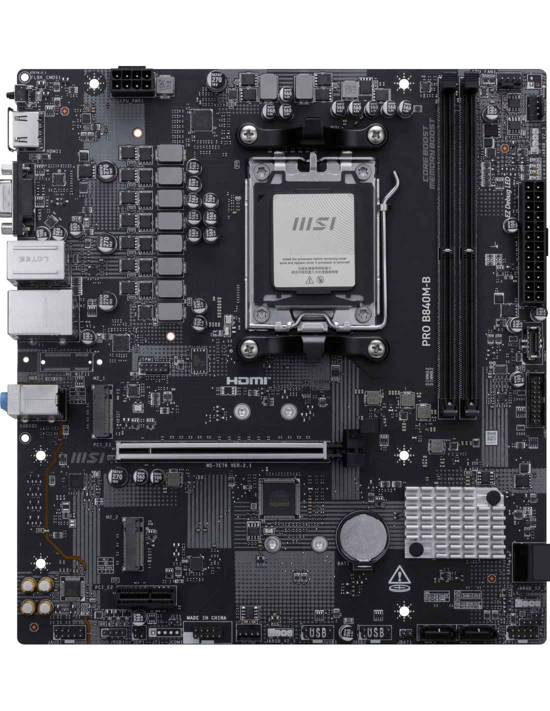 MSI PRO B840M-B. Fabricante de procesador: AMD, Socket de procesador: Zócalo AM5, Procesador compatible: AMD Ryzen 7000 Series, AMD Ryzen 8000 Series, AMD Ryzen 9000 Series. tipos de memoria compatibles: DDR5-SDRAM, Memoria interna máxima: 128 GB, Tipo de ranuras de memoria: DIMM. Interfaces de disco de almacenamiento soportados: M.2, Micro SATA III, Tipos de unidades de almacenamiento admitidas: HDD & SSD, Niveles RAID: 0, 1, 10. Tipo de interfaz ethernet: 2.5 Gigabit Ethernet, Controlador LAN: Realtek RTL8125D. Componente para: PC, Factor de forma: micro ATX, Familia del chipset: AMD