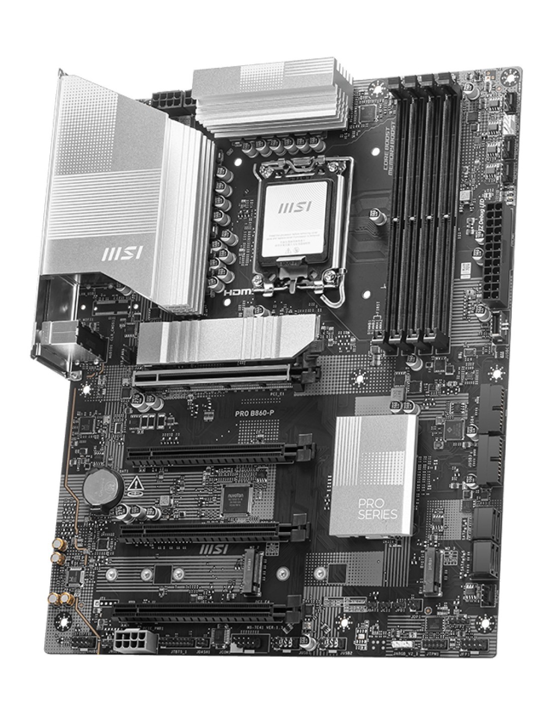 MSI PRO B860-P. Fabricante de procesador: Intel, Socket de procesador: LGA 1851 (Socket V1), Procesador compatible: Intel Core Ultra (Series 2). tipos de memoria compatibles: DDR5-SDRAM, Memoria interna máxima: 256 GB, Tipo de ranuras de memoria: DIMM. Interfaces de disco de almacenamiento soportados: M.2, Micro SATA III, Tipos de unidades de almacenamiento admitidas: HDD & SSD, Niveles RAID: 0, 1, 5, 10. Tipo de interfaz ethernet: 5 Gigabit Ethernet. Componente para: PC, Factor de forma: ATX, Familia del chipset: AMD