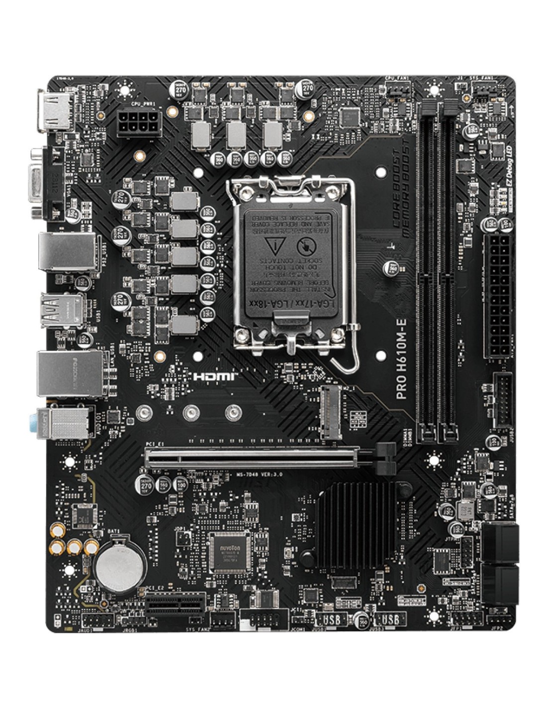 MSI PRO H610M-E. Fabricante de procesador: Intel, Socket de procesador: LGA 1700, Procesador compatible: Intel® Celeron®, Intel® Core™ i3, Intel® Core™ i5, Intel® Core™ i7, Intel® Core™ i9,.... tipos de memoria compatibles: DDR5-SDRAM, Memoria interna máxima: 96 GB, Tipo de ranuras de memoria: DIMM. Interfaces de disco de almacenamiento soportados: M.2, SATA III, Tipos de unidades de almacenamiento admitidas: HDD & SSD, Niveles RAID: 0, 1, 5, 10. Tipo de interfaz ethernet: 2.5 Gigabit Ethernet. Componente para: PC, Factor de forma: micro ATX, Familia del chipset: Intel