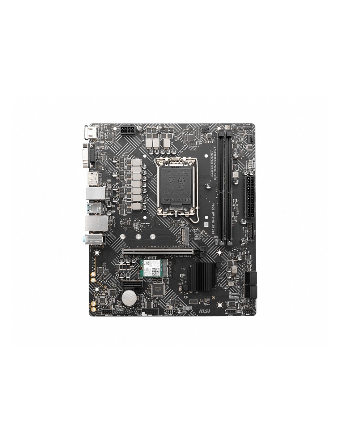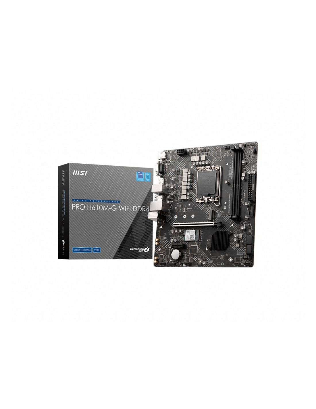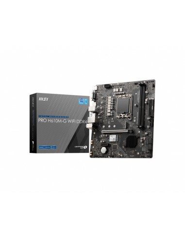 MSI PRO H610M-G WIFI DDR4. Fabricante de procesador: Intel, Socket de procesador: LGA 1700, Procesador compatible: Intel® Celeron®, Intel® Pentium®, Intel® Pentium® Gold. tipos de memoria compatibles: DDR4-SDRAM, Memoria interna máxima: 64 GB, Tipo de ranuras de memoria: DIMM. Interfaces de disco de almacenamiento soportados: M.2, SATA III, Tipos de unidades de almacenamiento admitidas: SSD, Niveles RAID: 0, 1, 5, 10. Tipo de interfaz ethernet: Gigabit Ethernet, Estándar Wi-Fi: Wi-Fi 5 (802.11ac), Wi-Fi estándares: 802.11a, 802.11b, 802.11g, Wi-Fi 4 (802.11n), Wi-Fi 5 (802.11ac). Componente para: PC, Factor de forma: micro ATX, Familia del chipset: Intel