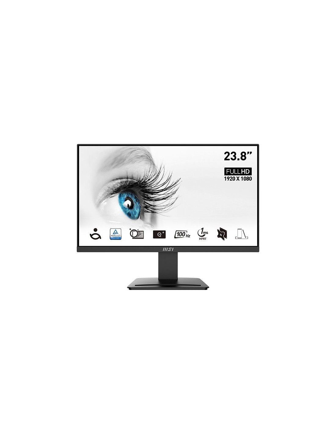 MSI Pro MP2412. Diagonal de la pantalla: 60,5 cm (23.8"), Resolución de la pantalla: 1920 x 1080 Pixeles, Tipo HD: Full HD, Tecnología de visualización: LCD, Tiempo de respuesta: 4 ms, Relación de aspecto nativa: 16:9, Ángulo de visión, horizontal: 178°, Ángulo de visión, vertical: 178°. montaje VESA. Color del producto: Negro