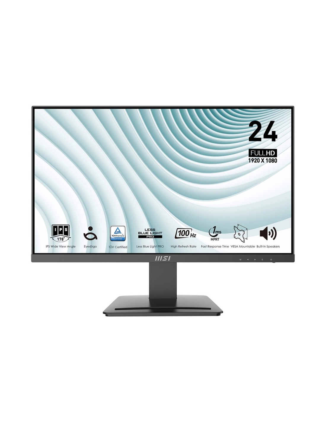 MSI Pro MP243X. Diagonal de la pantalla: 60,5 cm (23.8"), Resolución de la pantalla: 1920 x 1080 Pixeles, Tipo HD: Full HD, Tiempo de respuesta: 1 ms, Relación de aspecto nativa: 16:9, Ángulo de visión, horizontal: 178°, Ángulo de visión, vertical: 178°. Altavoces incorporados. montaje VESA. Color del producto: Negro
