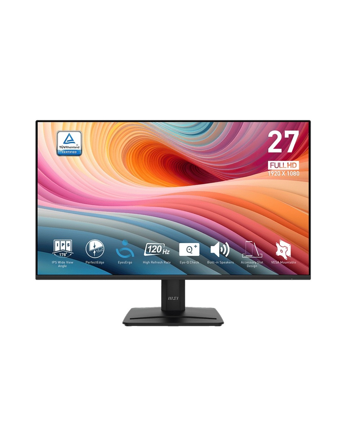 MSI Pro MP275 E2. Diagonal de la pantalla: 68,6 cm (27"), Resolución de la pantalla: 1920 x 1080 Pixeles, Tipo HD: Full HD, Tecnología de visualización: LED, Tiempo de respuesta: 4 ms, Relación de aspecto nativa: 16:9, Ángulo de visión, horizontal: 178°, Ángulo de visión, vertical: 178°. Altavoces incorporados. montaje VESA. Color del producto: Negro