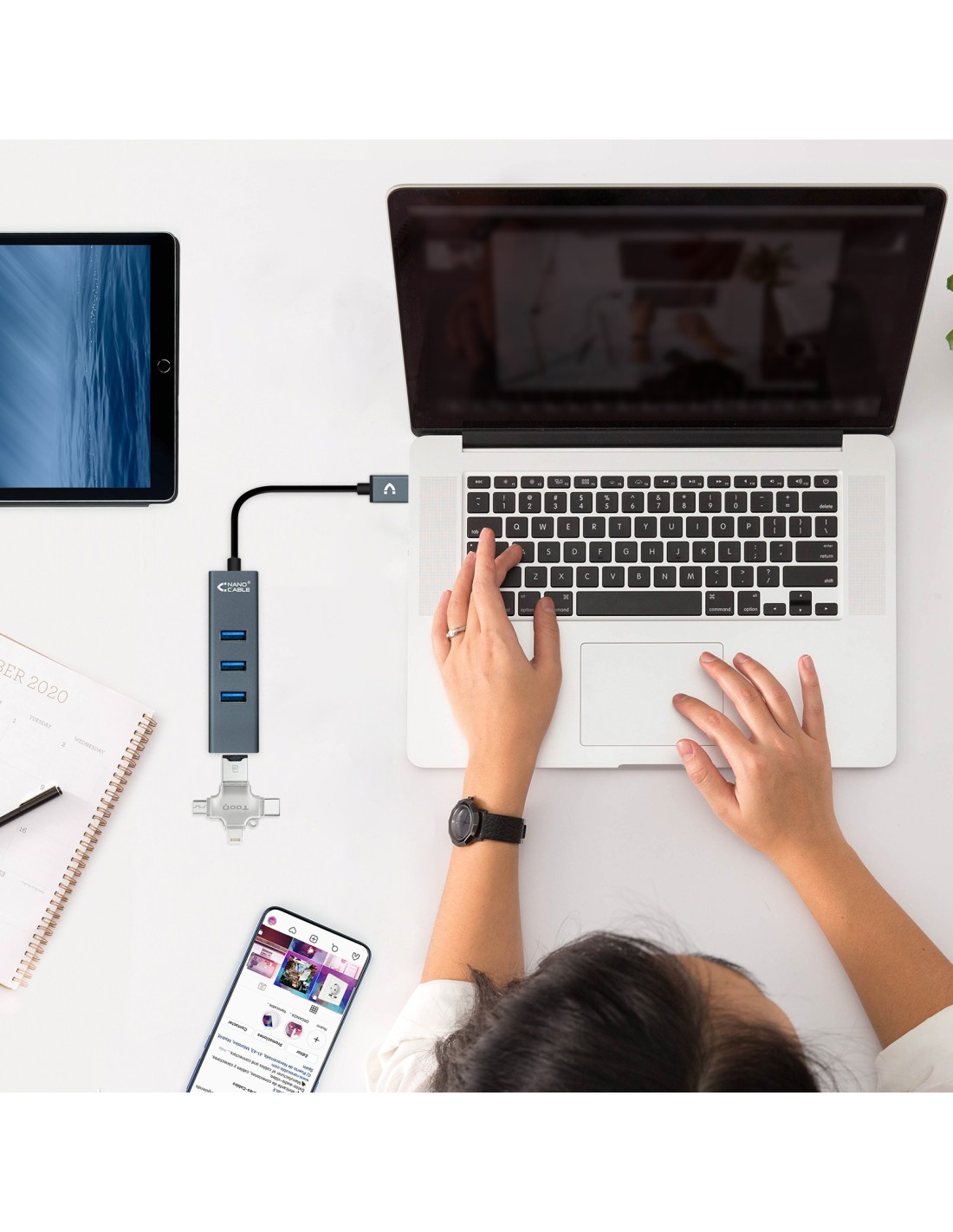 Nanocable USB 3.0 4xUSB3.0. USB-A/M-USB 3.0/H, Gris, 10 cm, USB 3.2 Gen 1 (3.1 Gen 1) Type-A, USB 3.2 Gen 1 (3.1 Gen 1) Type-A, Gris, 0,1 m, 24 mm, 86 mm