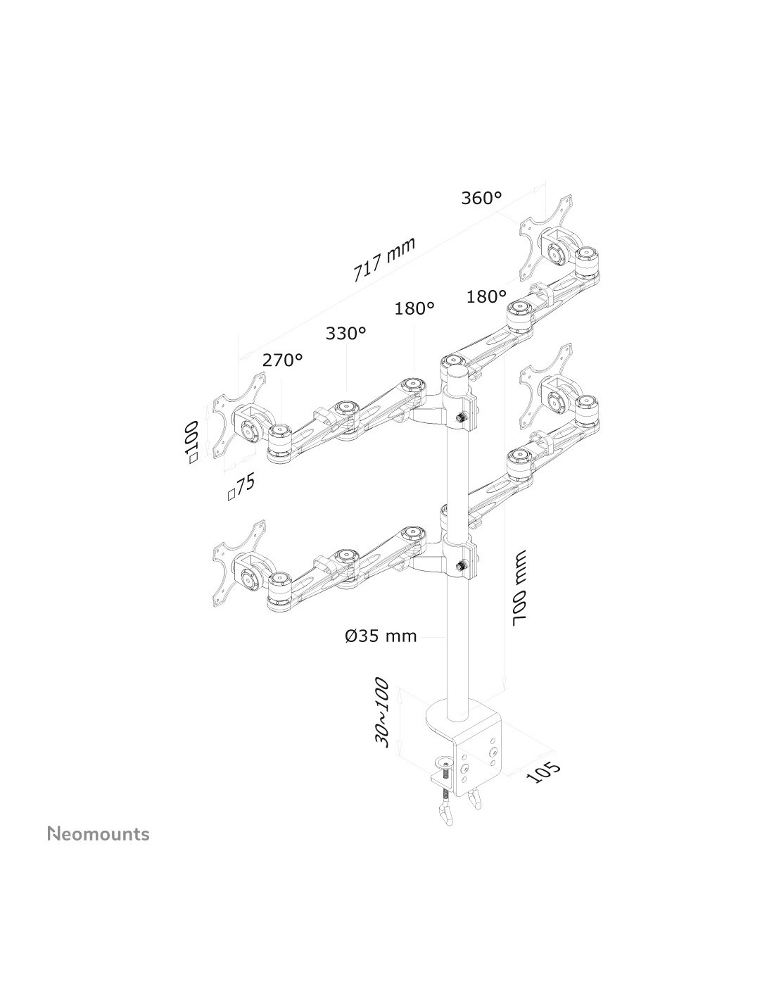 Neomounts FPMA-D935D4 Brazo de monitor 10-27". Montaje: Abrazadera, Capacidad máxima de peso: 6 kg, Tamaño mínimo de pantalla: 25,4 cm (10"), Tamaño máximo de pantalla: 68,6 cm (27"), Compatibilidad con interfaz de montaje (min): 75 x 75 mm, Compatibilidad con interfaz de montaje (max): 100 x 100 mm. Ajustes de altura, Ángulo de inclinación: 0 - 180°. Color del producto: Plata