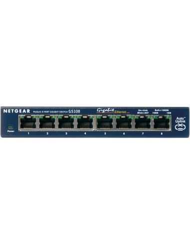 NETGEAR GS108GE. Tipo de interruptor: No administrado. Puertos tipo básico de conmutación RJ-45 Ethernet: Gigabit Ethernet (10/100/1000), Cantidad de puertos básicos de conmutación RJ-45 Ethernet: 8. Bidireccional completo (Full duplex). Tabla de direcciones MAC: 8000 entradas, Capacidad de conmutación: 16 Gbit/s. Estándares de red: IEEE 802.3ab, IEEE 802.3i, IEEE 802.3u