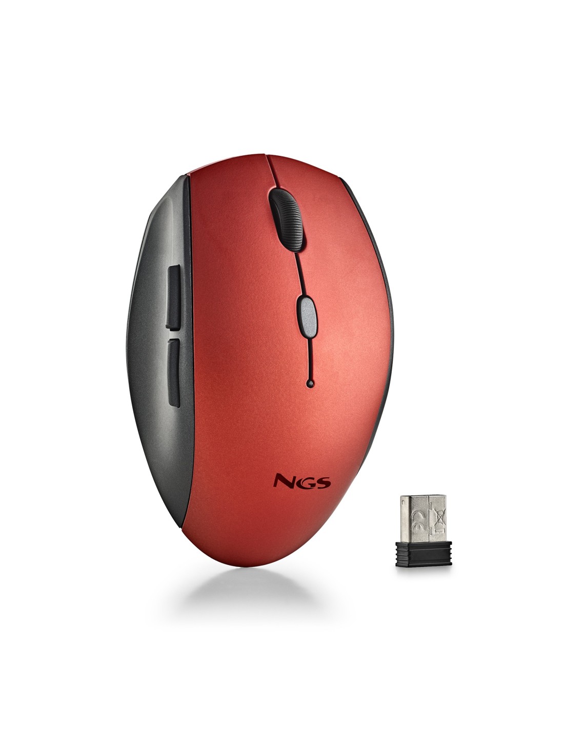NGS BEE. Factor de forma: mano derecha, Diseño vertical. Tecnología de detección de movimientos: Óptico, Interfaz del dispositivo: RF inalámbrico, Resolución de movimiento: 1600 DPI, Tipo de botones: Botones presionados, Cantidad de botones: 5, Tipo de desplazamiento: Rueda. Fuente de energía: Baterías. Trabaja en cualquier superficie. Color del producto: Rojo