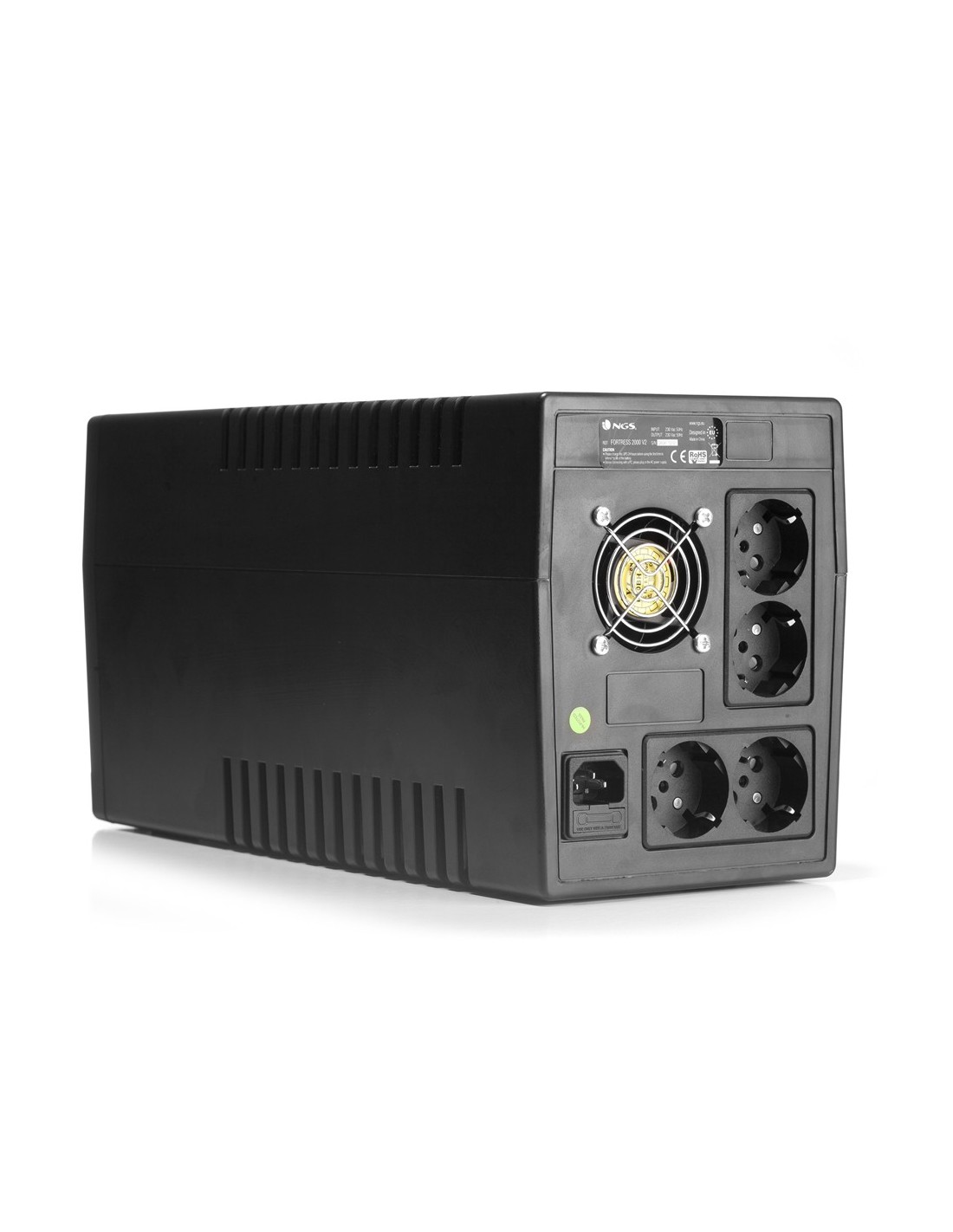 NGS FORTRESS 2000 V2. Topología UPS: En espera (Fuera de línea) o Standby (Offline), Capacidad de potencia de salida (VA): 1,5 kVA, Potencia de salida: 900 W. Cantidad de salidas AC: 4 salidas AC. Factor de forma: Torre, Color del producto: Negro, Tipo de visualizador: LED