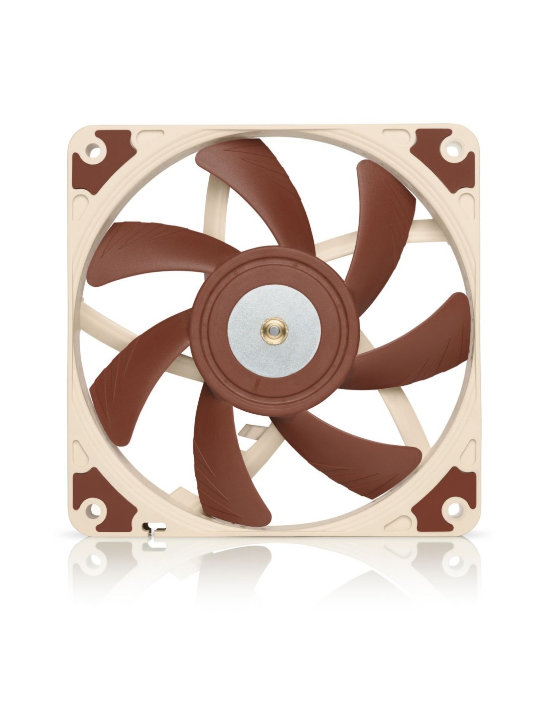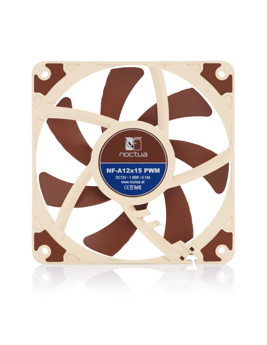 Noctua NF-A12x15 PWM. Tipo: Ventilador, Diámetro de ventilador: 12 cm, Velocidad de rotación (mín.): 450 RPM, Velocidad de rotación (máx.): 1850 RPM, flujo de aire: 94,2 m³/h, Presión de aire mínima: 0,9 mmH2O, Presión máxima de aire: 1,53 mmH2O, Tipo de soporte: Self-Stabilising Oil-pressure Bearing (SSO). Voltaje: 5 - 12 V. Ancho: 120 mm, Profundidad: 120 mm, Altura: 15 mm. Color del producto: Beige, Marrón
